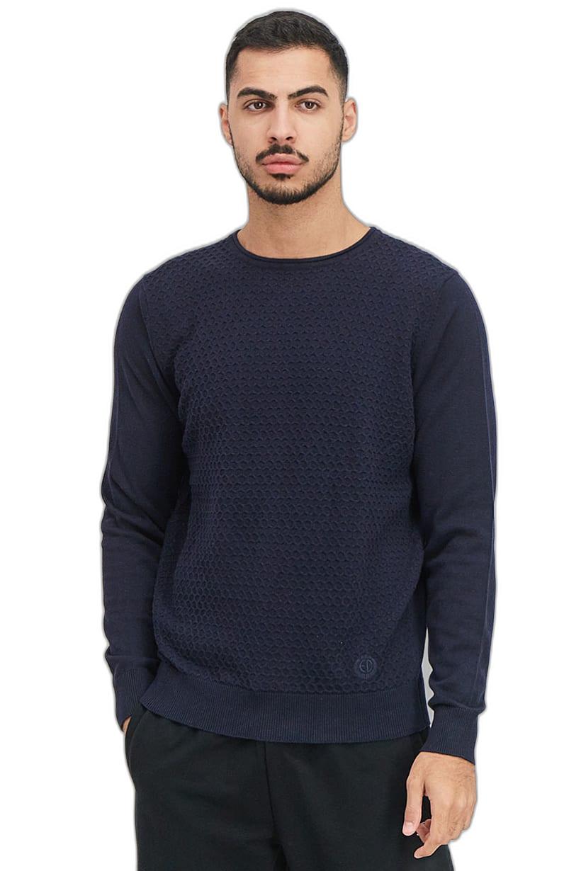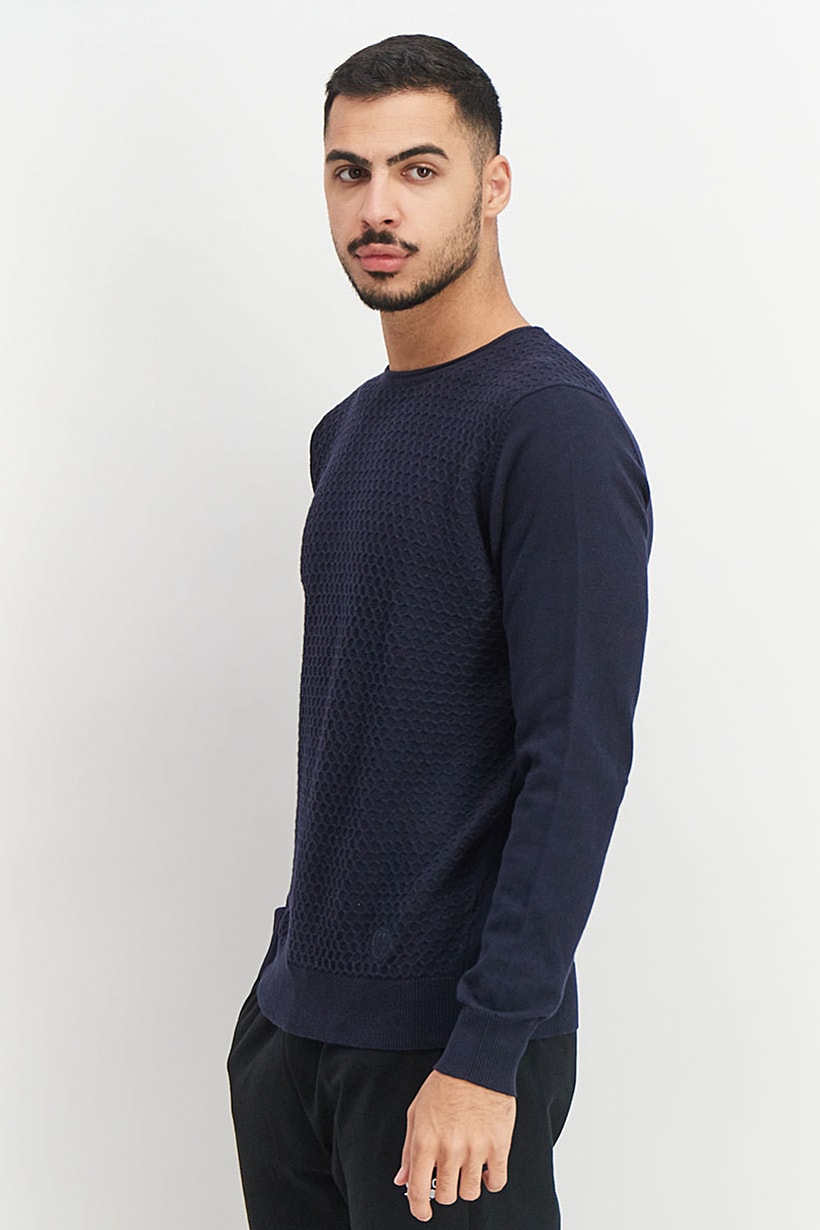 This product is made of 100% cotton and is machine washable. It has a sportswear fit and is designed for outdoor activities. The sweater has a textured pattern and a pullover closure. The color of the product may slightly vary due to photographic lighting sources or monitor settings. The product is available in international sizes and is a light thickness. The color family of the product is navy blue.