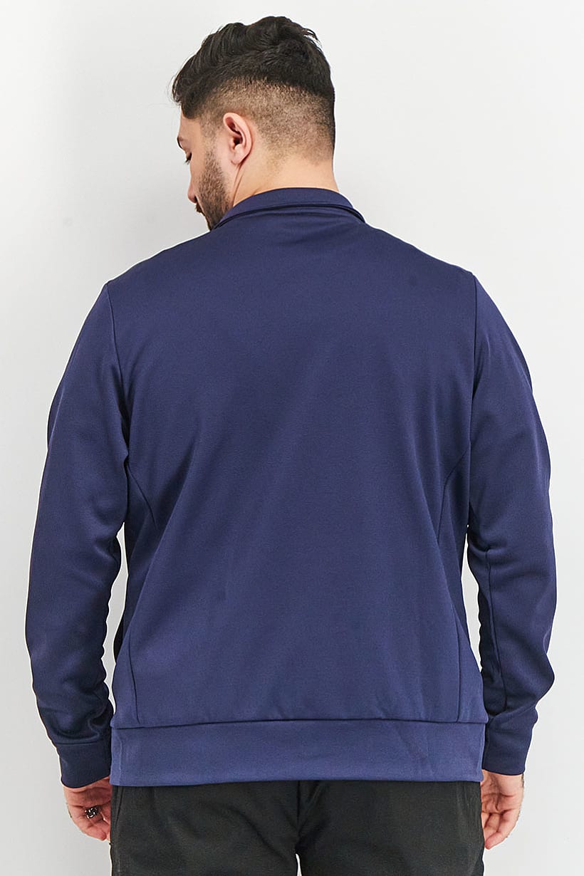 This product is suitable for men and is designed for training purposes. It is made of 100% polyester fabric and can be easily machine washed. The jacket has a zipper closure and comes in a navy blue color. Please note that the product color may appear slightly different due to lighting or monitor settings. The design features a plain/solid pattern and is categorized as sportswear.