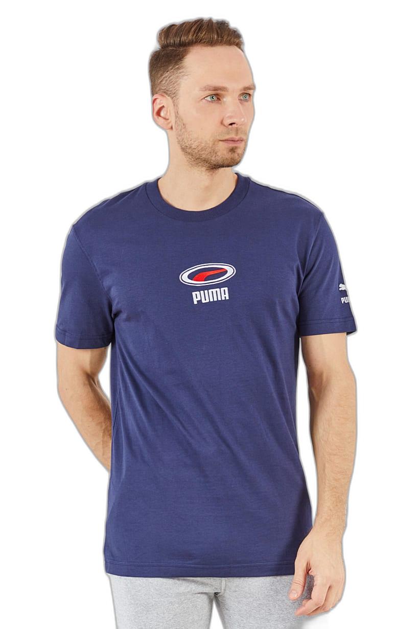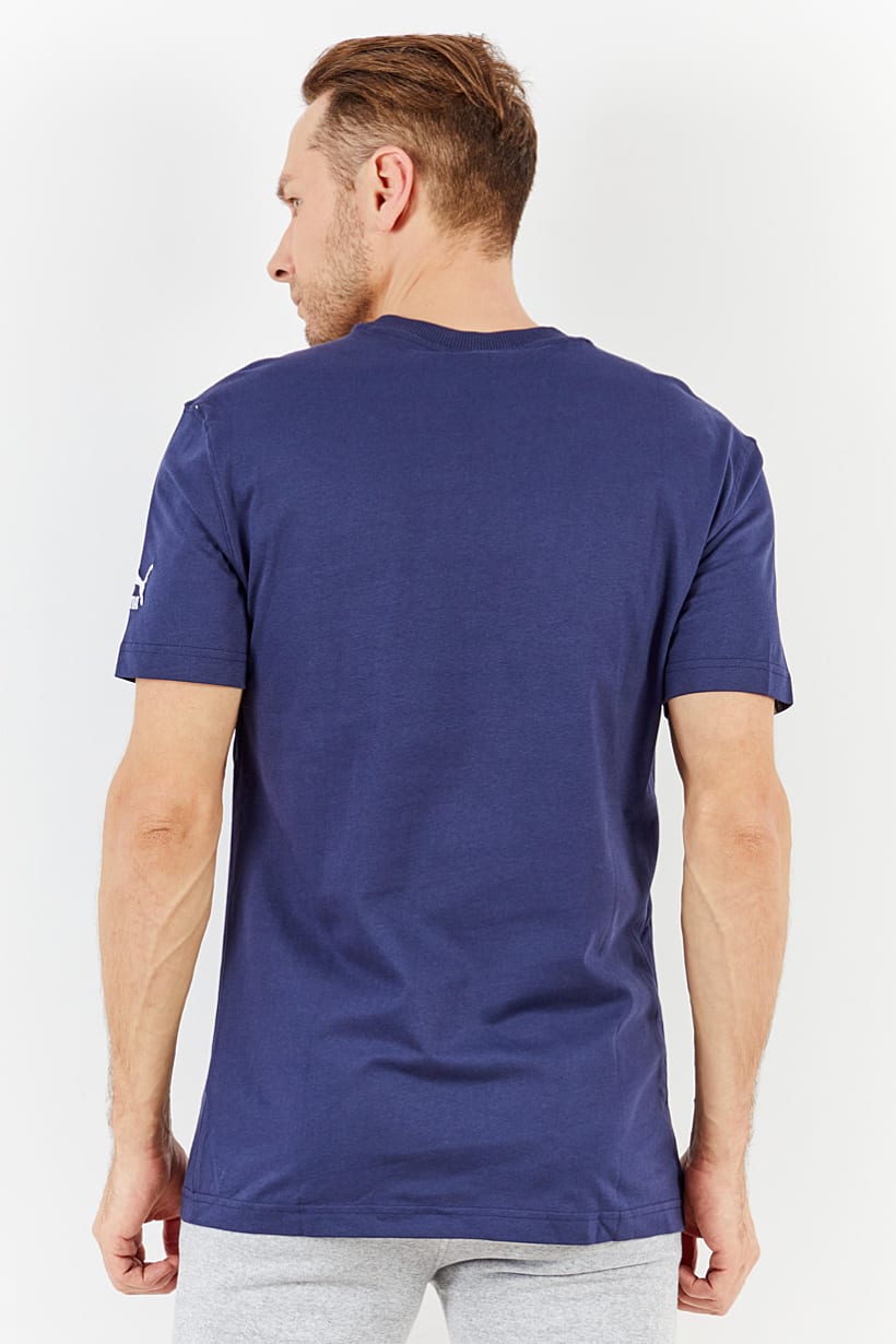 This product is easy to care for as it is machine washable. It has a regular fit and is available in US sizes. The fabric is made of 100% cotton and is light in thickness, making it suitable for training. Please note that the product color may appear slightly different due to lighting or monitor settings. The t-shirt features an embroidered pattern and print, and comes in a navy blue color. It is categorized as sportswear.