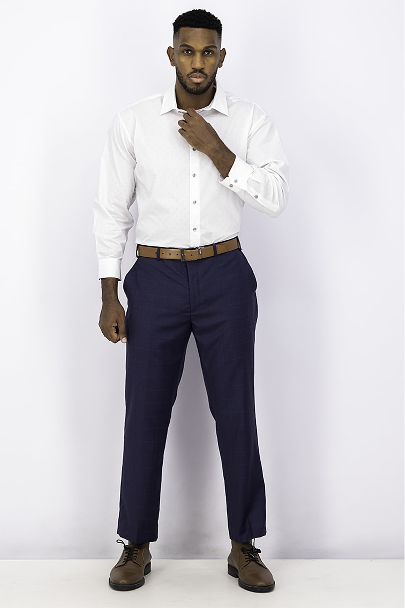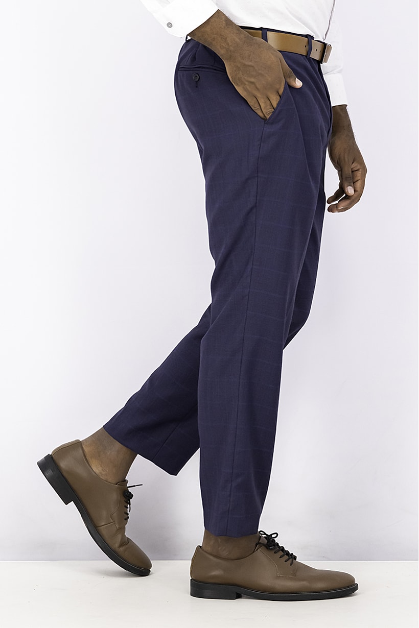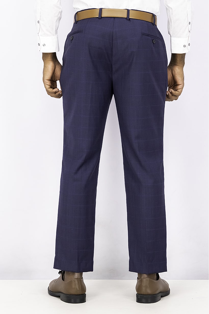 Care : Machine washable, Fit : Regular fit, No of pockets : 4, Pant Style : Dress, Size shown : Inches, Stretch Type : No stretch, Types of Jeans Rise : Mid rise, Bottom Closure : Hook and bar, Zipper fly, Bottom Style/Pattern : Belt loops, Disclaimer : Product color may slightly vary due to photographic lighting sources or your monitor settings., Fabrics : 70% Wool, 30% Polyester, Occasion : Casual, Pattern & Print : Plaid, Color Family : Navy Blue,