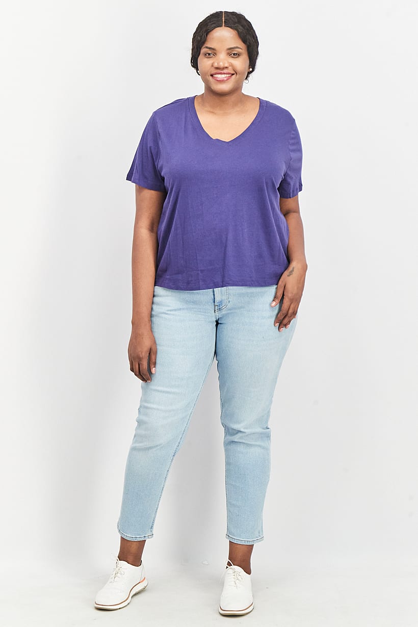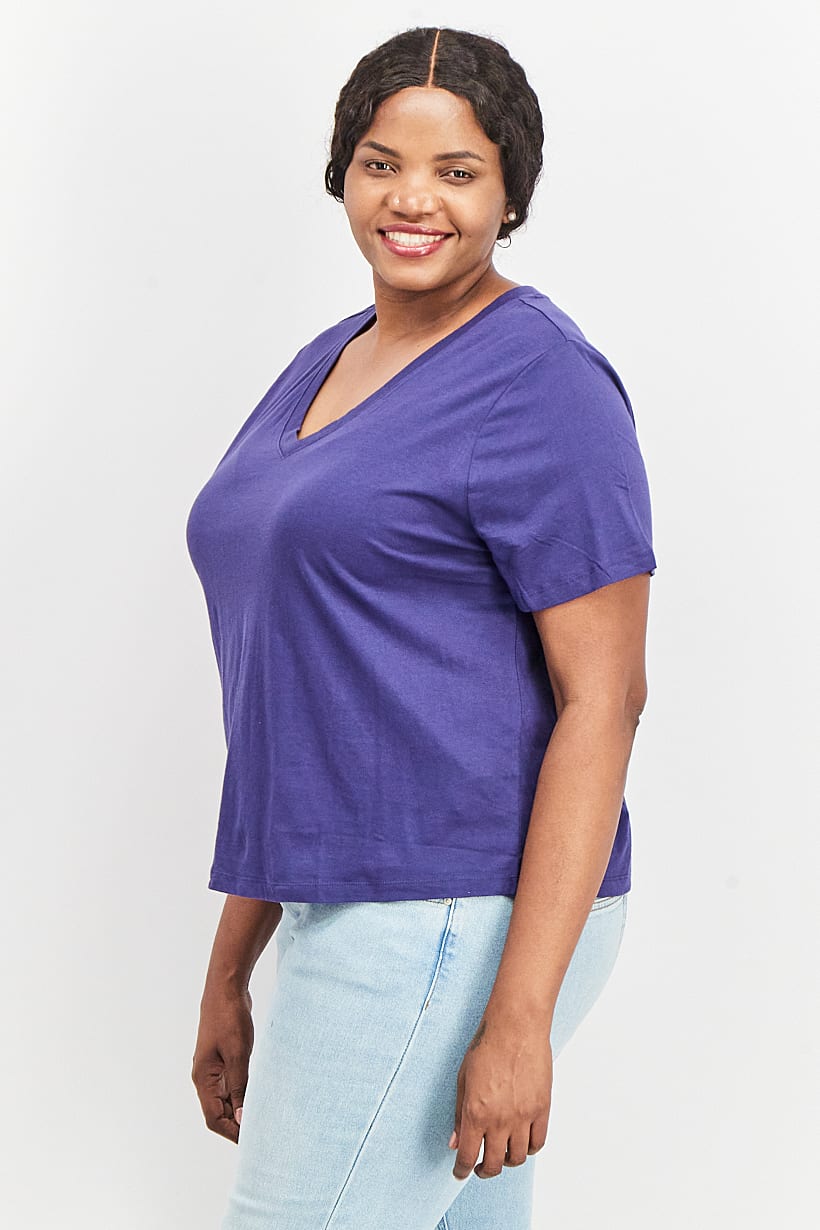 | descriptionOriginal | Care : Machine washable, Fit : Plus Size, Size shown : US, Top Style : T-Shirt, Types of Hem : Straight hem, Types of Neckline & Collar : V-neckline, Types of Sleeve : Short sleeve, Disclaimer : Product color may slightly vary due to photographic lighting sources or your monitor settings., Fabrics : 100% Cotton, Occasion : Casual, Pattern & Print : Plain/Solid, Types of Closures : Pullover, Color Family : Navy Blue, |