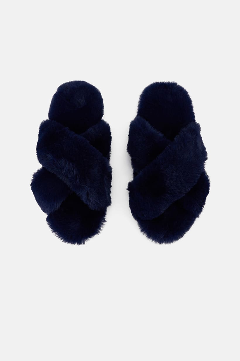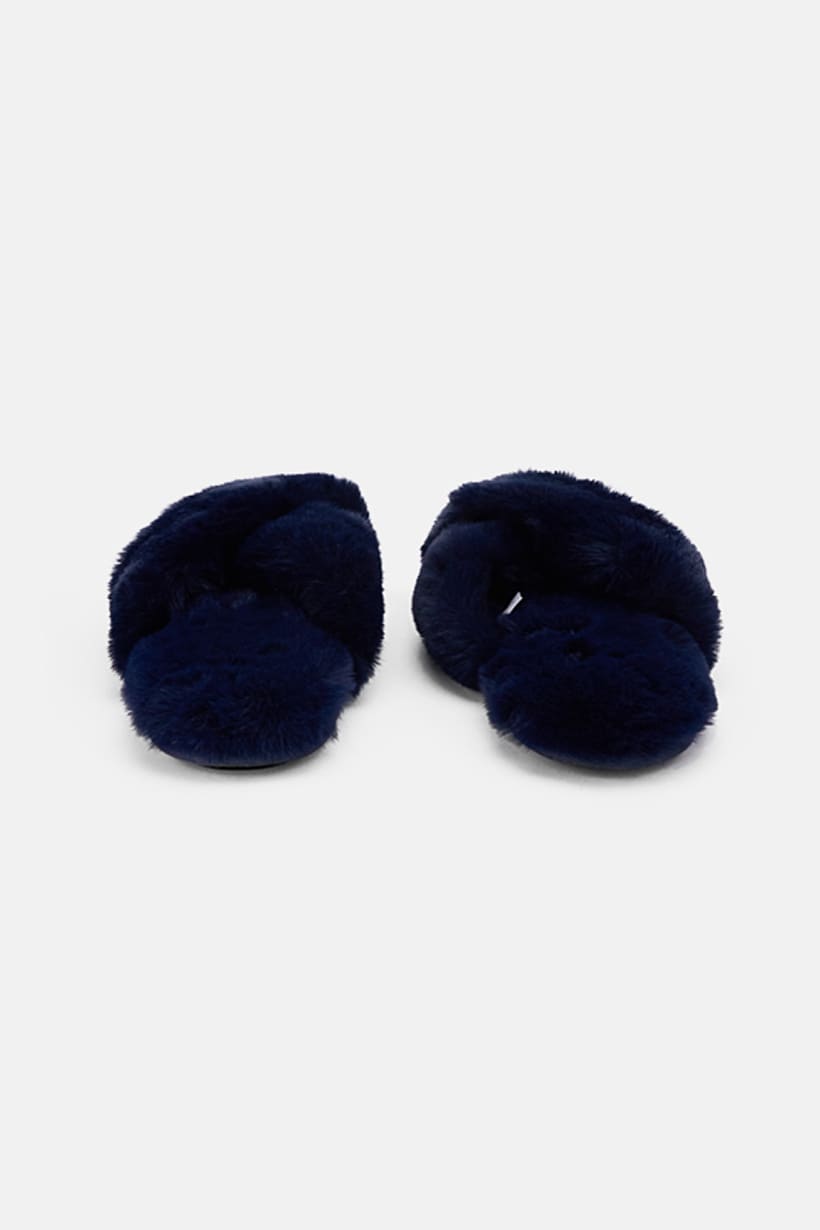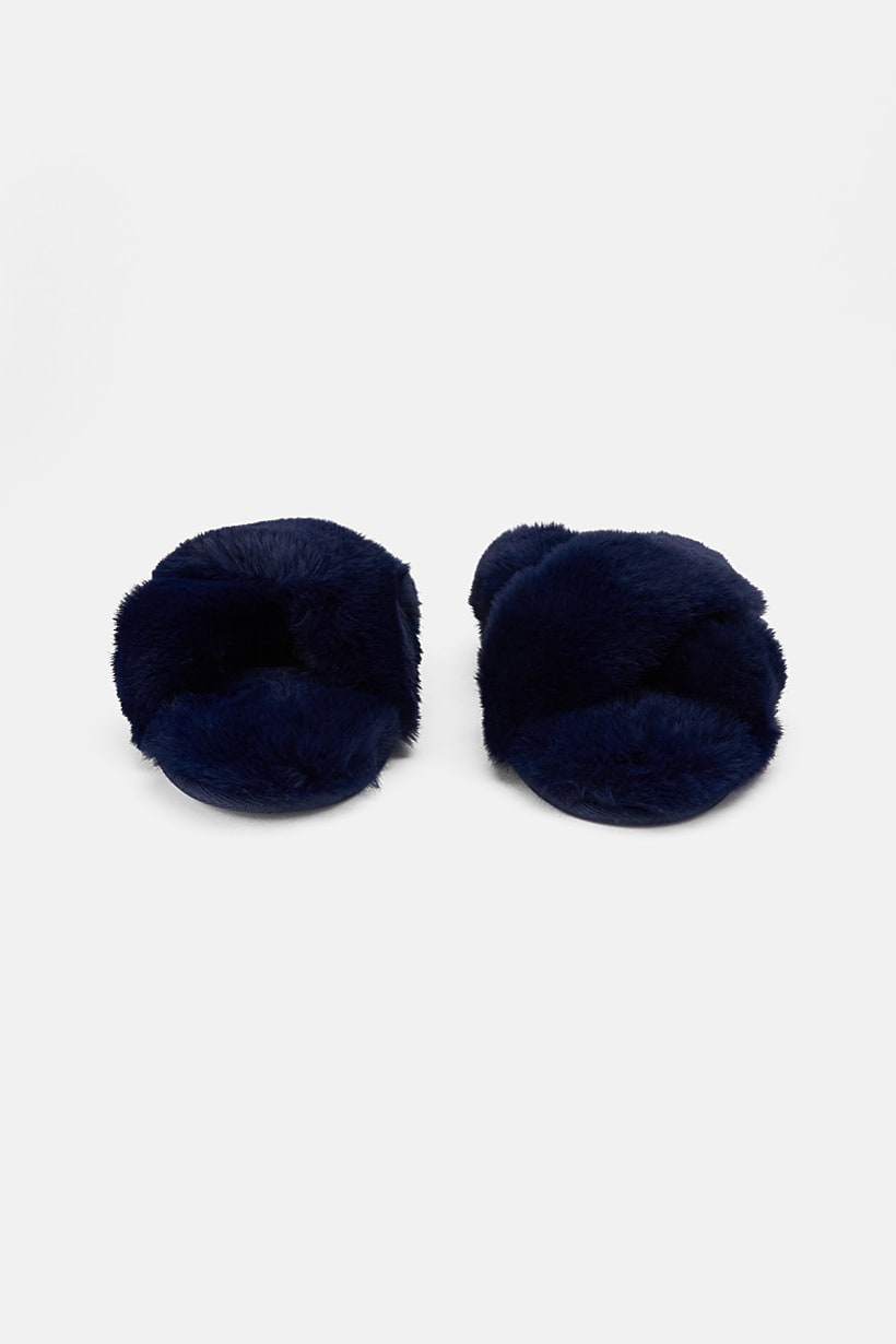 This product features a slip-on design with an open toe and a textured pattern on the faux fur material. The rubber sole provides comfort and durability, making it ideal for casual occasions. Please note that accessories are included with this navy blue shoe that has no heel, making it perfect for women.