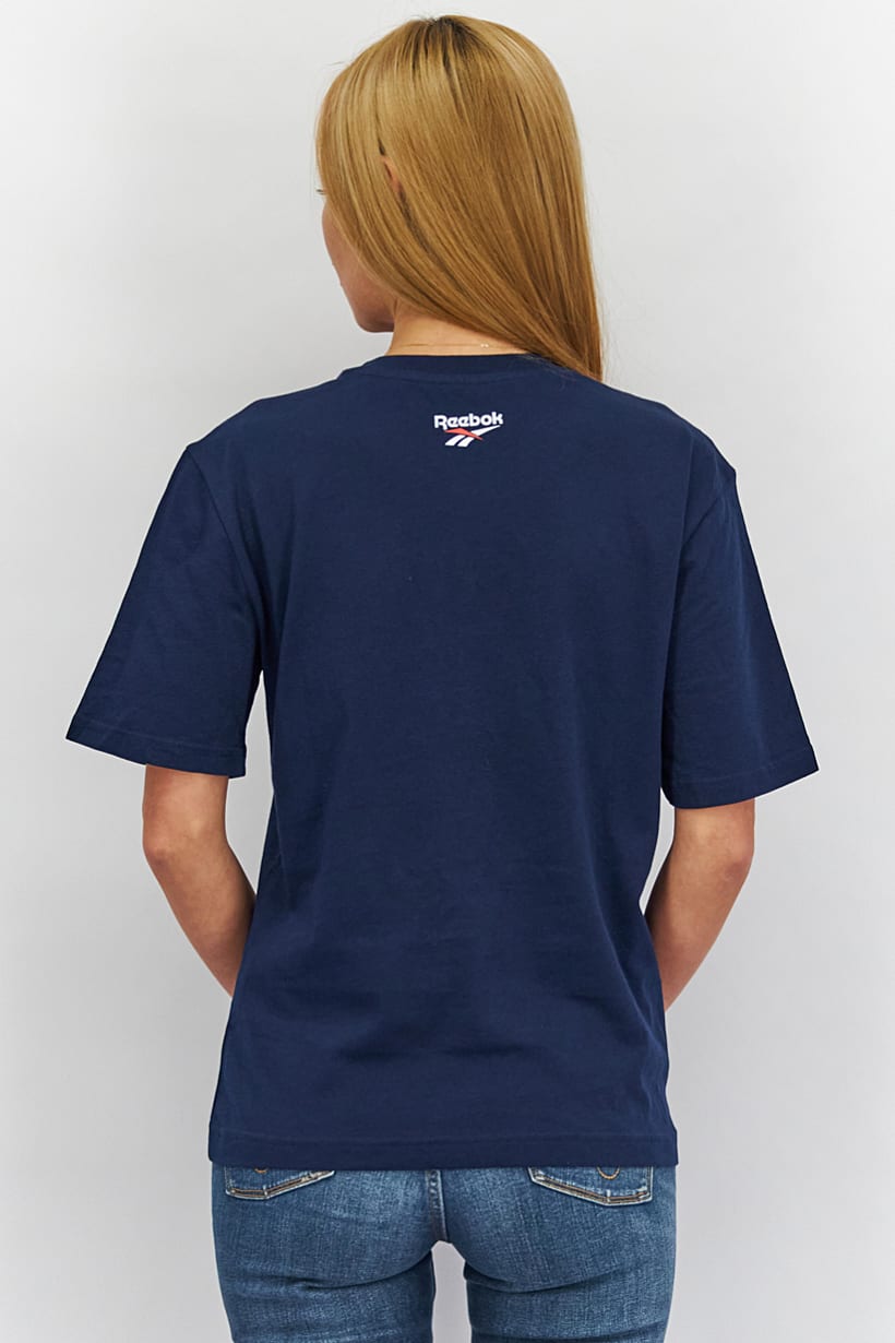 This product is easy to care for as it is machine washable. It has a sportswear fit and is available in US sizes. The fabric is made of 100% cotton and is light in thickness, making it suitable for training. Please note that the product color may appear slightly different due to lighting or monitor settings. The top features a brand logo print and is categorized as sportswear in navy blue color.