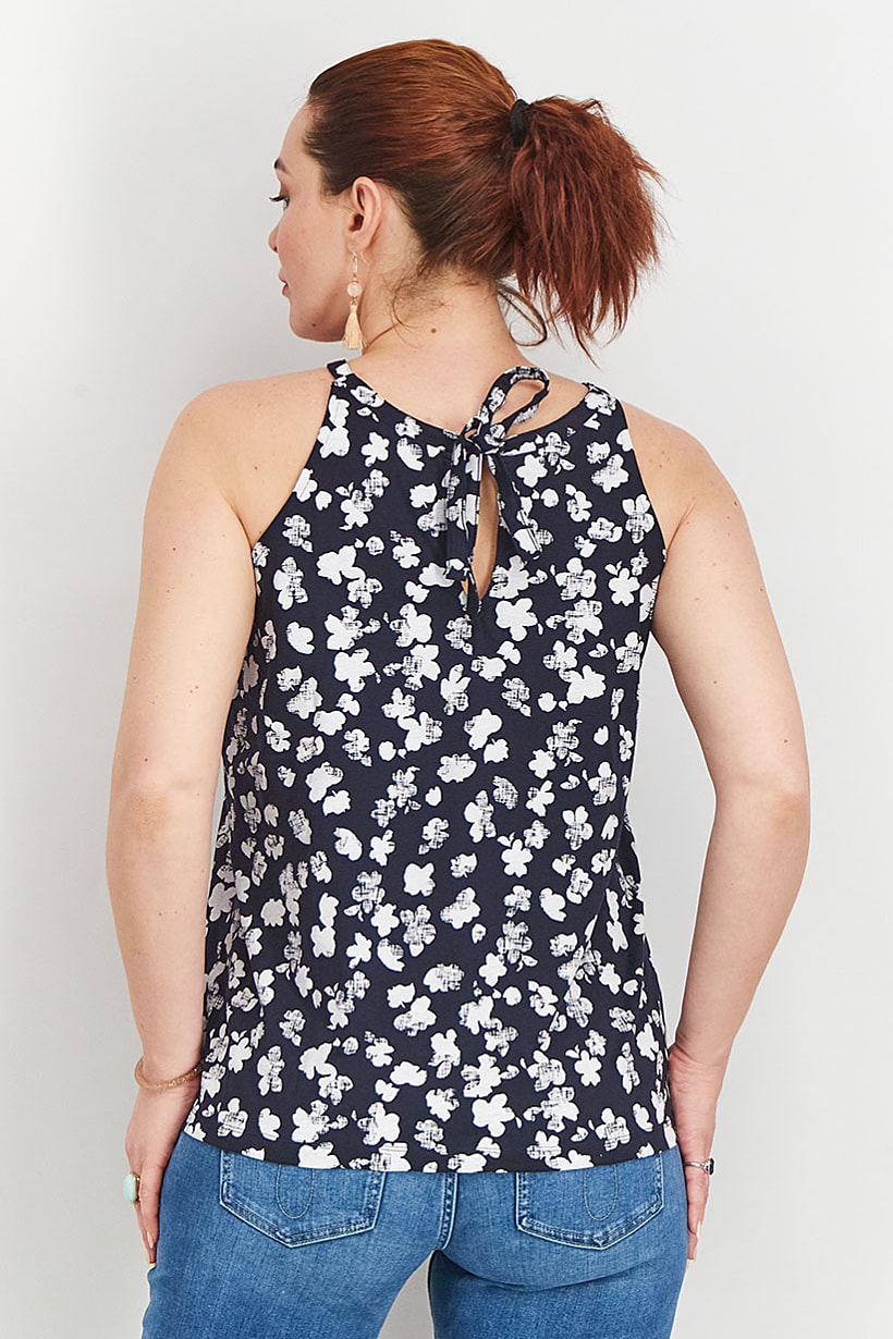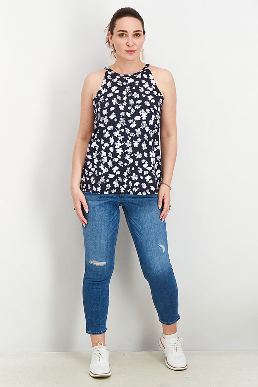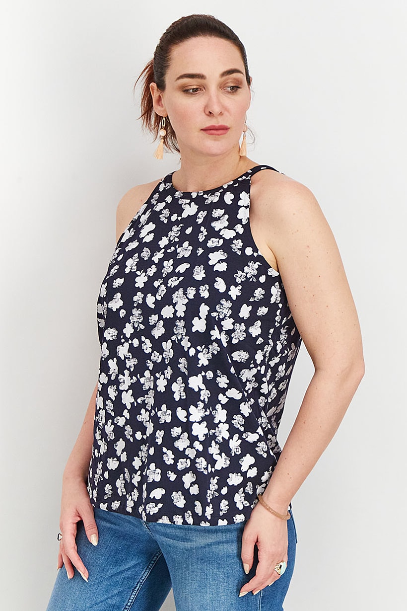 Women Round Neck Sleeveless Allover Print Top, Navy