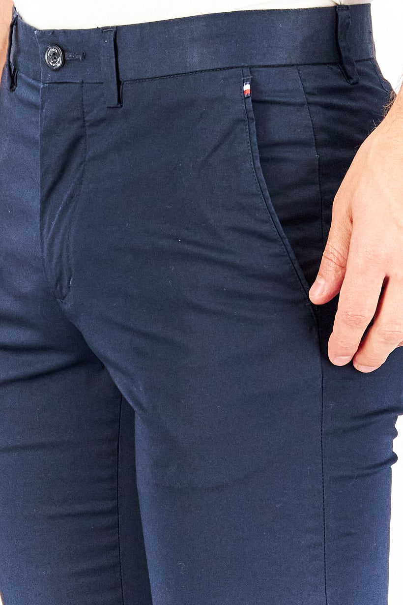 Care : Machine washable, Fit : Straight, No of pockets : 4, Pant Style : Chino, Size shown : Inches, Stretch Type : No stretch, Types of Jeans Rise : Mid rise, Bottom Closure : Zipper fly, Bottom Style/Pattern : Four pocket style, Disclaimer : Product color may slightly vary due to photographic lighting sources or your monitor settings., Fabrics : 97% Cotton, 3% Elastane, Occasion : Semi Formal, Pattern & Print : Plain/Solid, Color Family : Navy Blue,