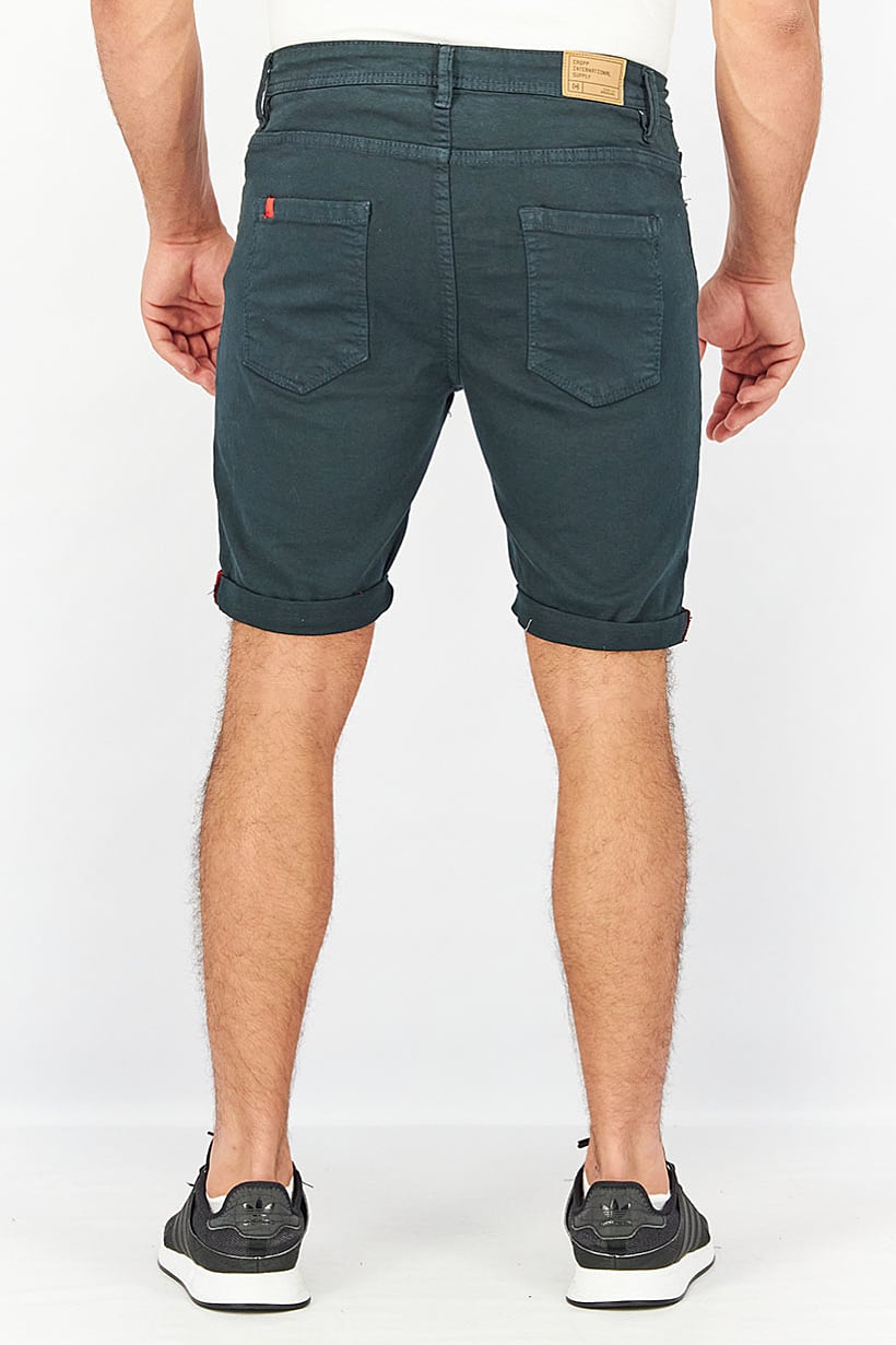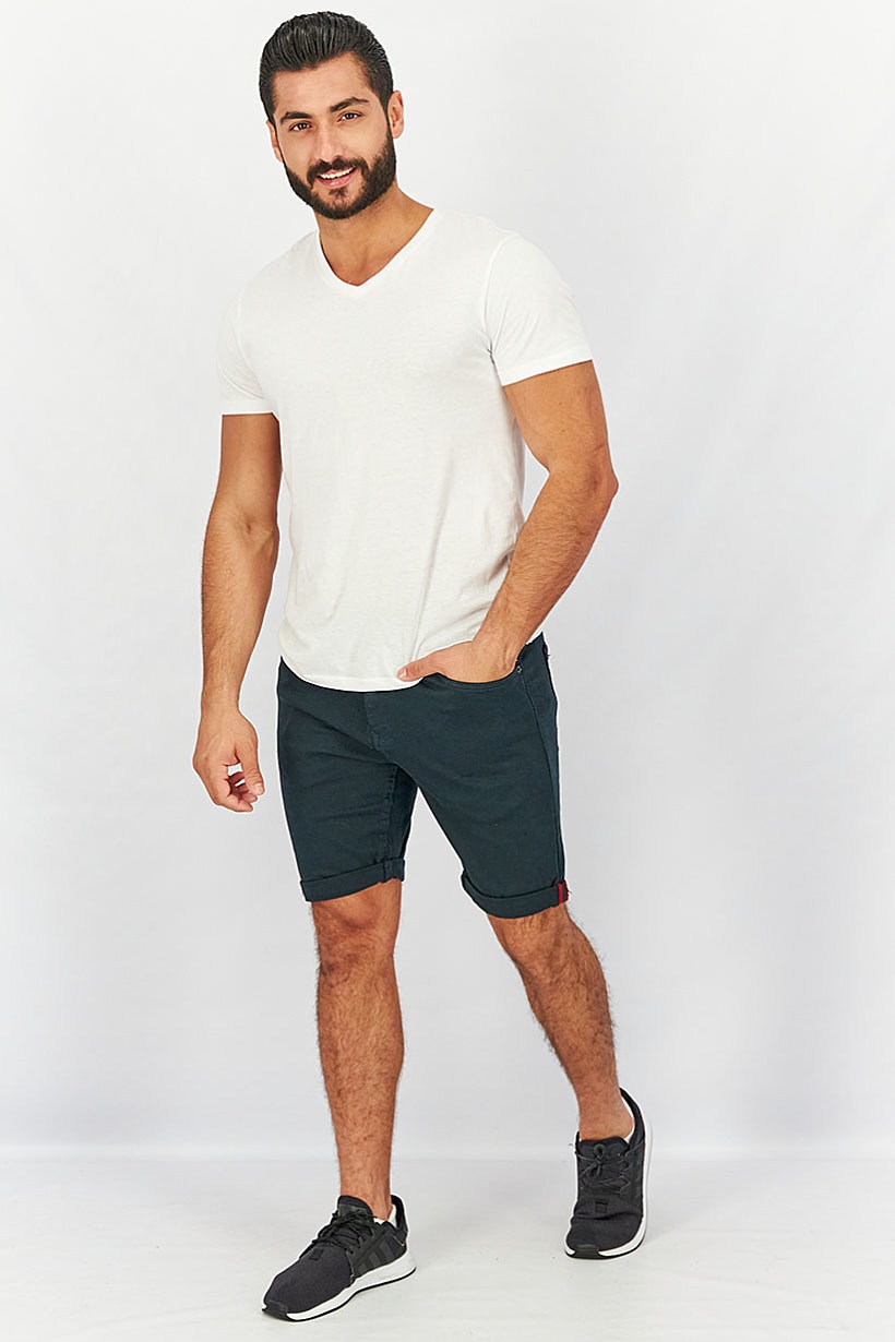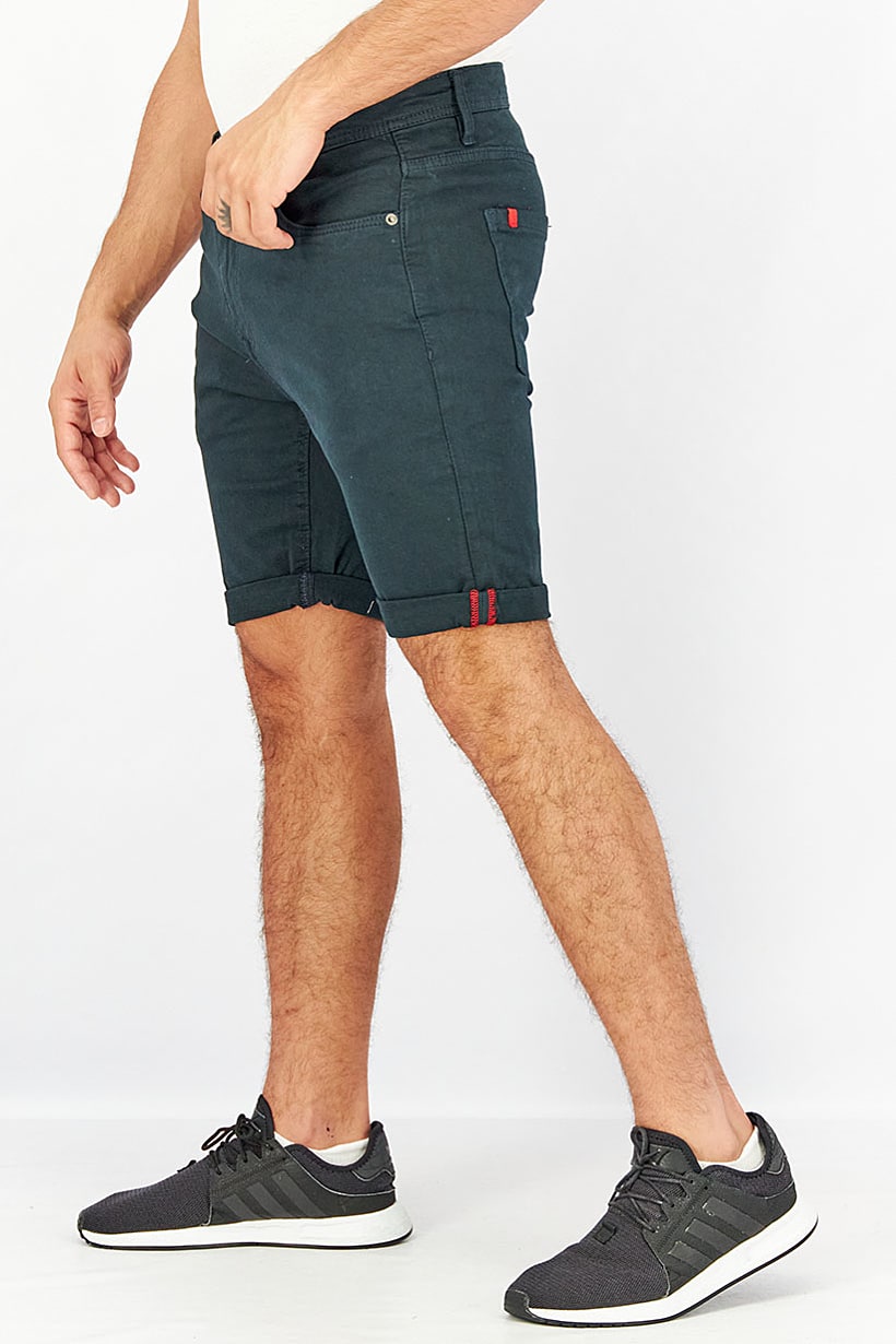 Care : Machine washable, Fit : Regular fit, No of pockets : 5, Size shown : Inches, Stretch Type : Stretchable, Type of Short : Denim short, Bottom Closure : Button fly, Fabrics : 99% Cotton, 1% Elastane, Occasion : Casual, Pattern & Print : Plain/Solid, Color Family : Navy Blue,