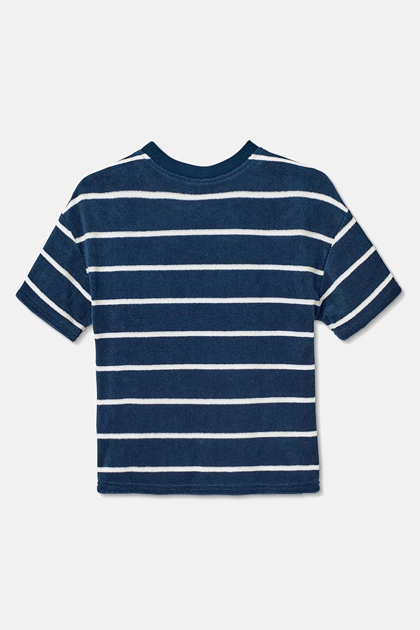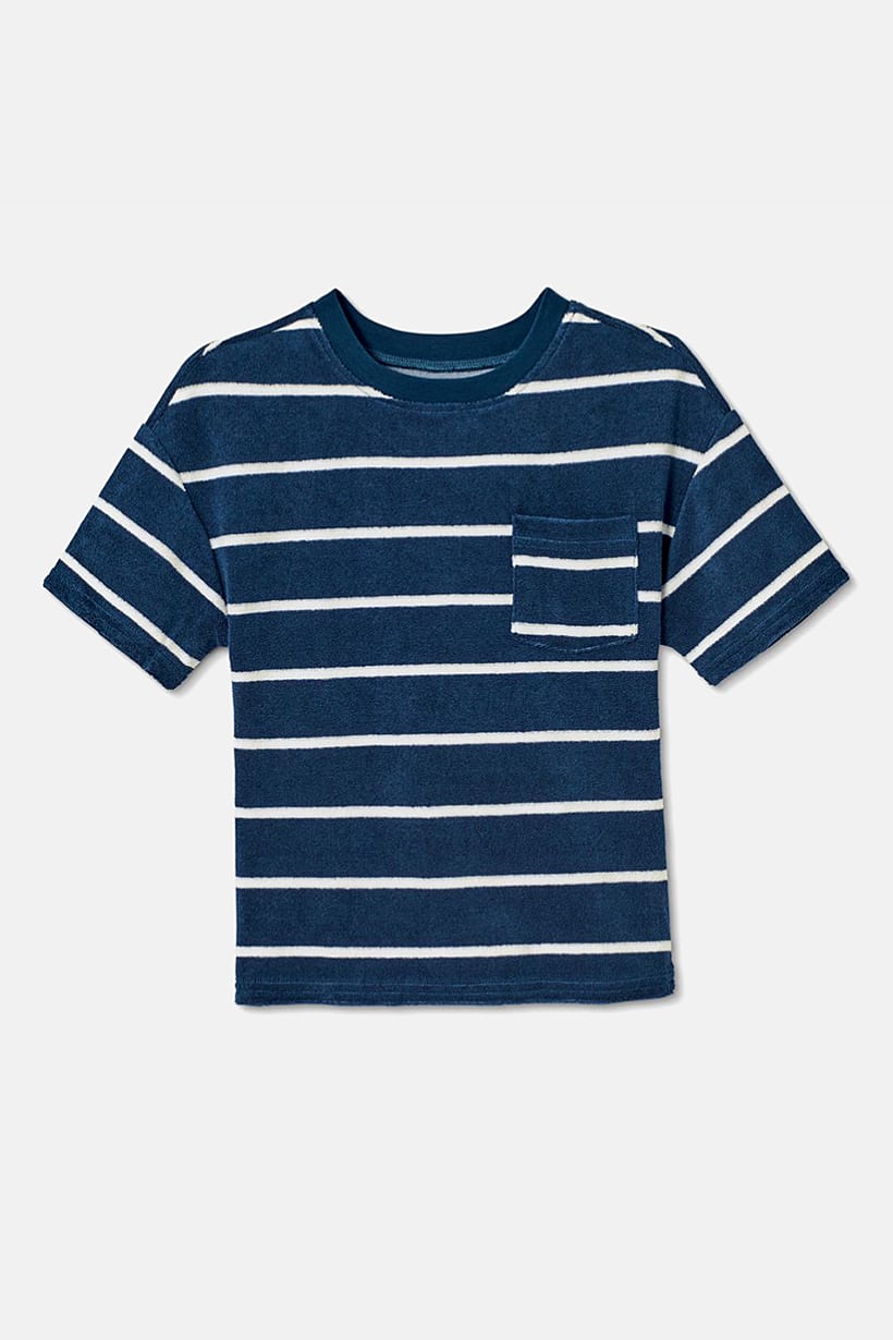 Care : Machine washable, Ideal For : Boys, Sleeve Length : Short Sleeve, Type of Hem : Straight hem , Types of Neckline & Collar : Crew neckline, Fabrics : 78% Cotton, 22% Polyester, Occasion : Casual, Pattern & Print : Stripe, Type of Sleeve : Short sleeve , Types of Closures : Pullover, Color Family : Navy Blue,