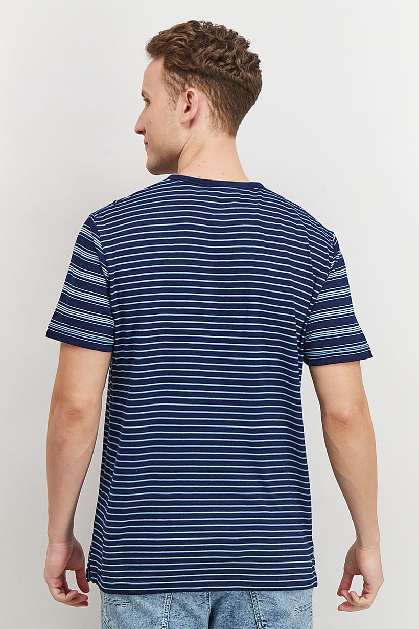 | descriptionOriginal | Care : Machine washable, Fit : Regular fit, Size shown : International, Sleeve Length : Short Sleeve, T-Shirt Style : Crew Neck, Type of Hem : Straight hem , Type of Neckline & Collar : Crew neckline , Fabrics : 100% Cotton, Occasion : Casual, Pattern & Print : Stripe, Types of Closures : Pullover, Color Family : Navy Blue, |