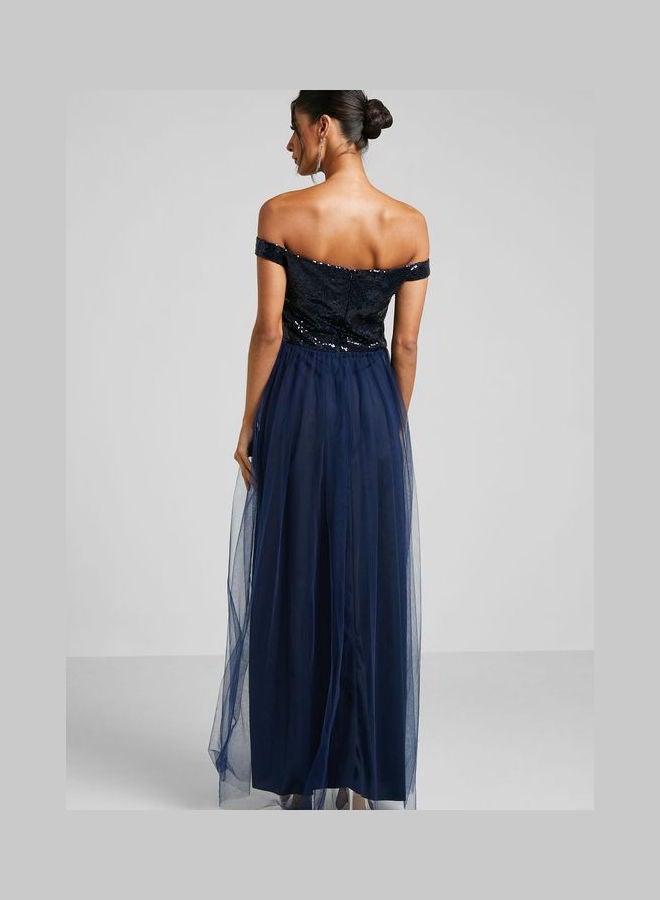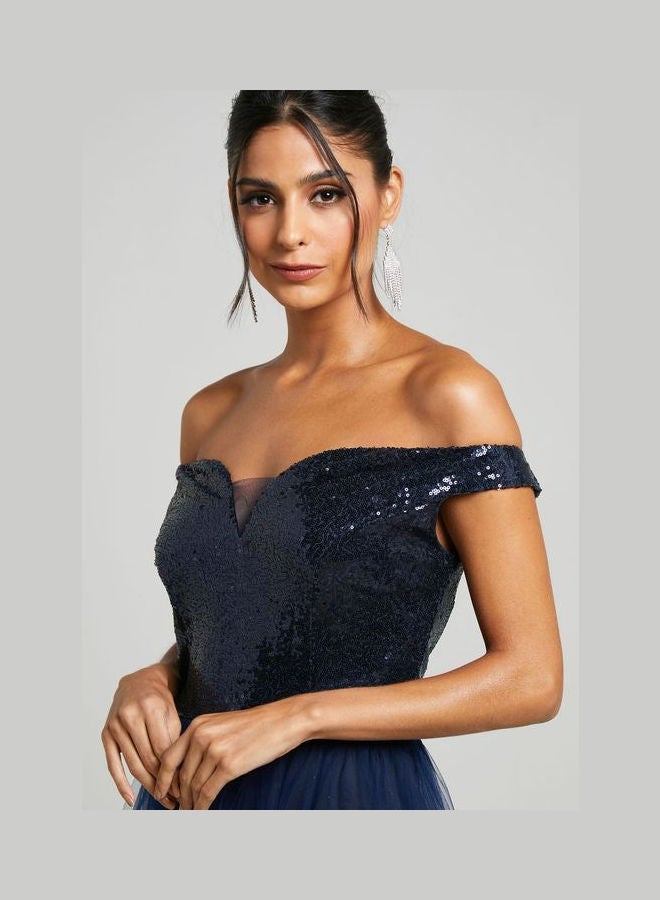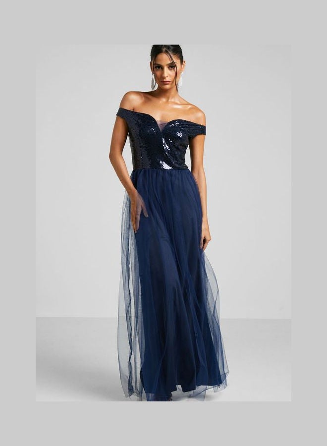 This maxi dress boasts a comfortable polyester fabric that is adorned with shimmering sequins. The off-shoulder style features a plunging neckline, while the reverse is secured with a concealed zipper closure.
