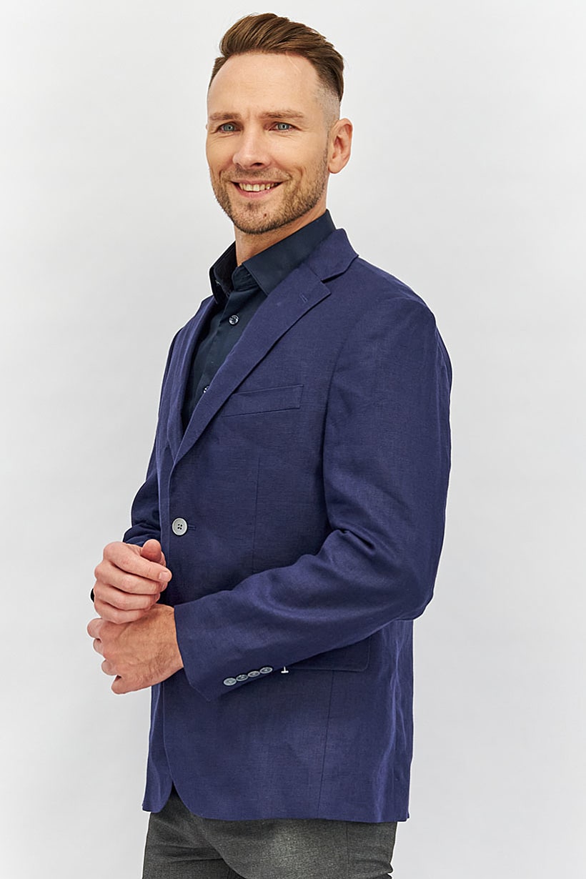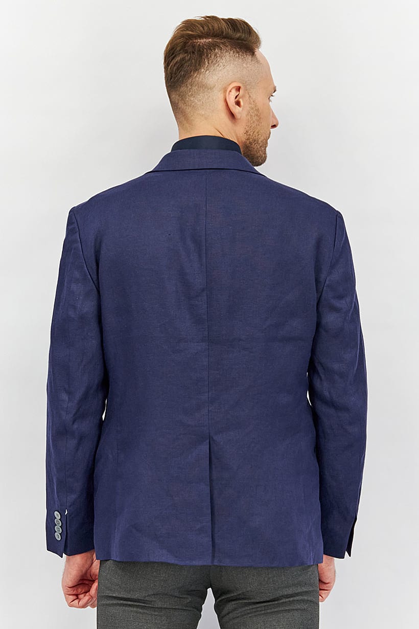This suit jacket is made of 100% linen and features a notched collar. It has a regular fit and is suitable for formal occasions. Please note that the product color may appear slightly different due to lighting or monitor settings. The size shown is in inches and the color family is navy blue. Dry cleaning is recommended for care.