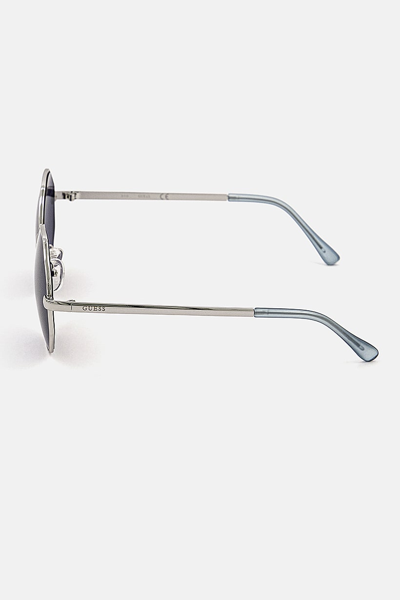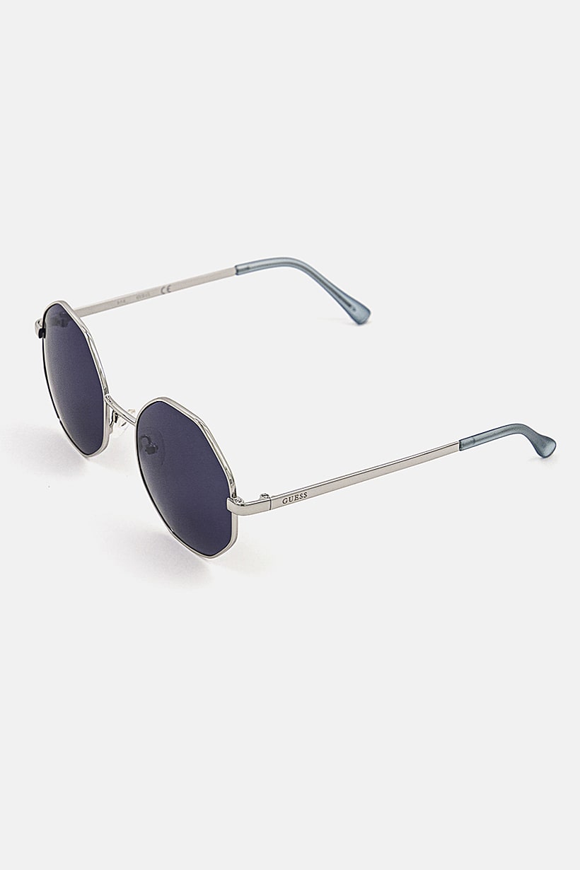 This product boasts a sleek silver frame with a full rim design, complemented by blue lenses that provide reliable protection against harmful UV rays. The lenses are crafted from high-quality acetate material, while the adjustable nose pads ensure a comfortable fit. The navy blue color family adds a touch of sophistication to these stylish sunglasses.