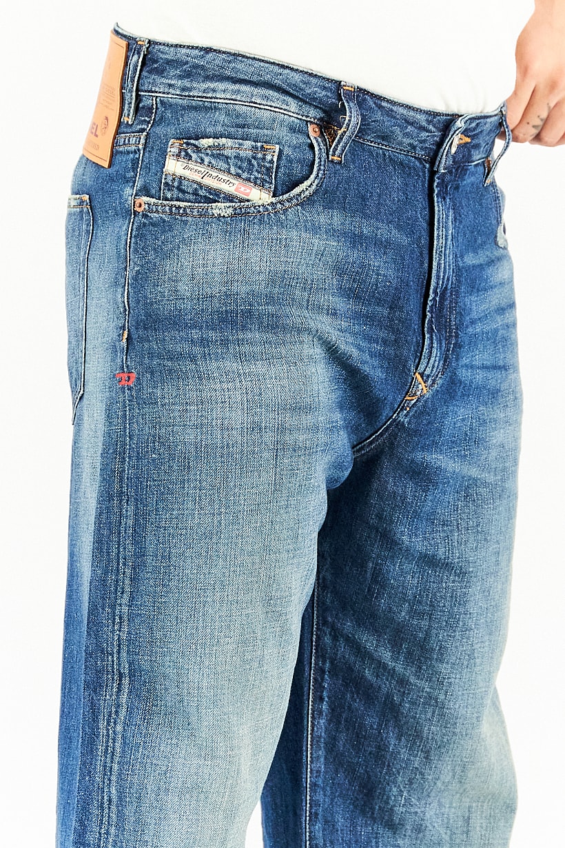 This product features a regular fit with a straight bottom hem and low rise. It includes five pockets and a button closure with belt loops. The fabric is a blend of 60% cotton and 40% linen, with a washed navy blue pattern and print. It is machine washable, but please note that the product color may vary slightly due to lighting or monitor settings. This item does not have stretch. The size shown is international.