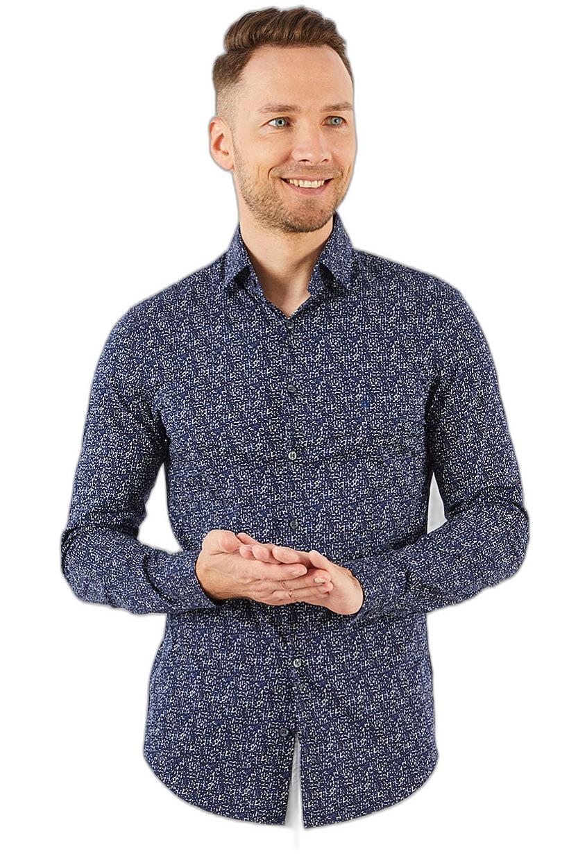 This product is easy to care for as it is machine washable. It has a slim fit and is available in inches. The long sleeves have a straight hem and the neckline features a spread collar. Please note that the product color may vary slightly due to lighting or monitor settings. The fabric is made of 97% cotton and 3% elastane, with an allover print. The closure is buttoned and the color family is navy blue. This product is suitable for semi-formal occasions.