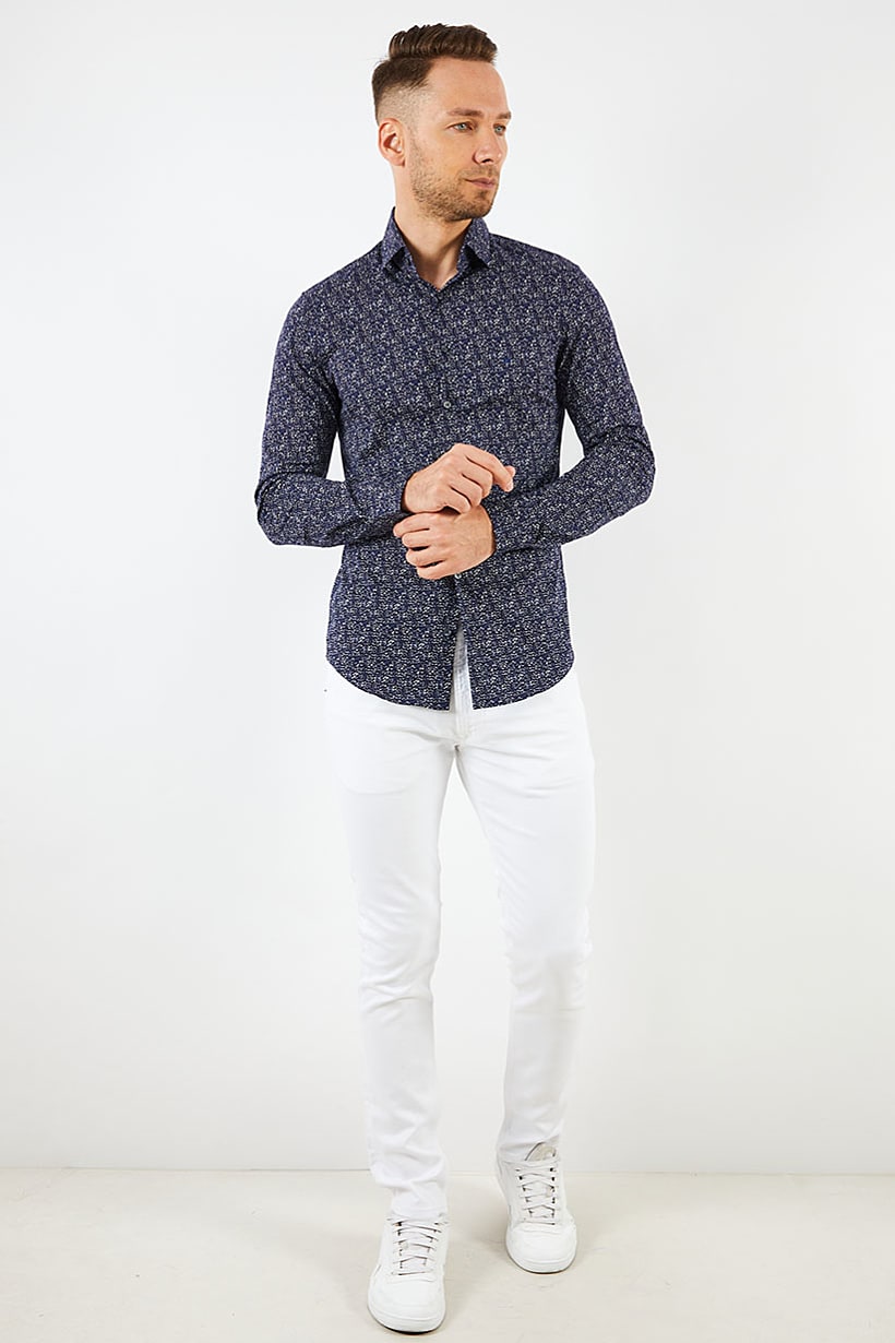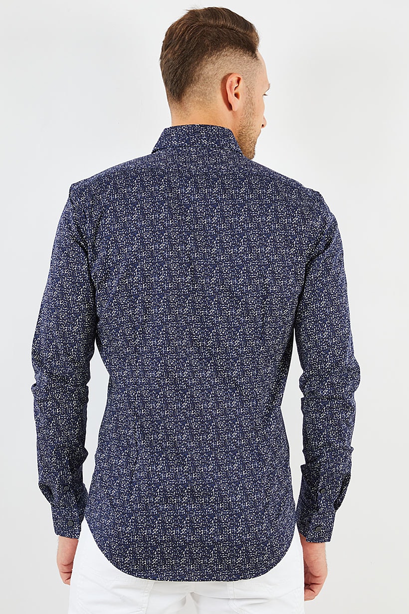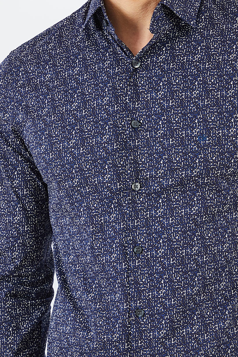 Care : Machine washable, Fit : Slim fit, Size shown : Inches, Sleeve Length : Long Sleeve, Type of Hem : Straight hem , Type of Neckline & Collar : Spread collar , Disclaimer : Product color may slightly vary due to photographic lighting sources or your monitor settings., Fabrics : 97% Cotton, 3% Elastane, Pattern & Print : Allover print, Types of Closures : Button, Color Family : Navy Blue, Occasion : Semi Formal,