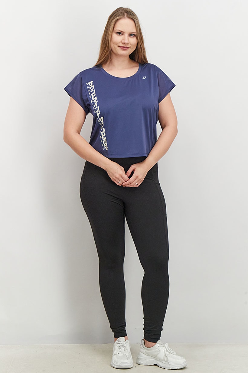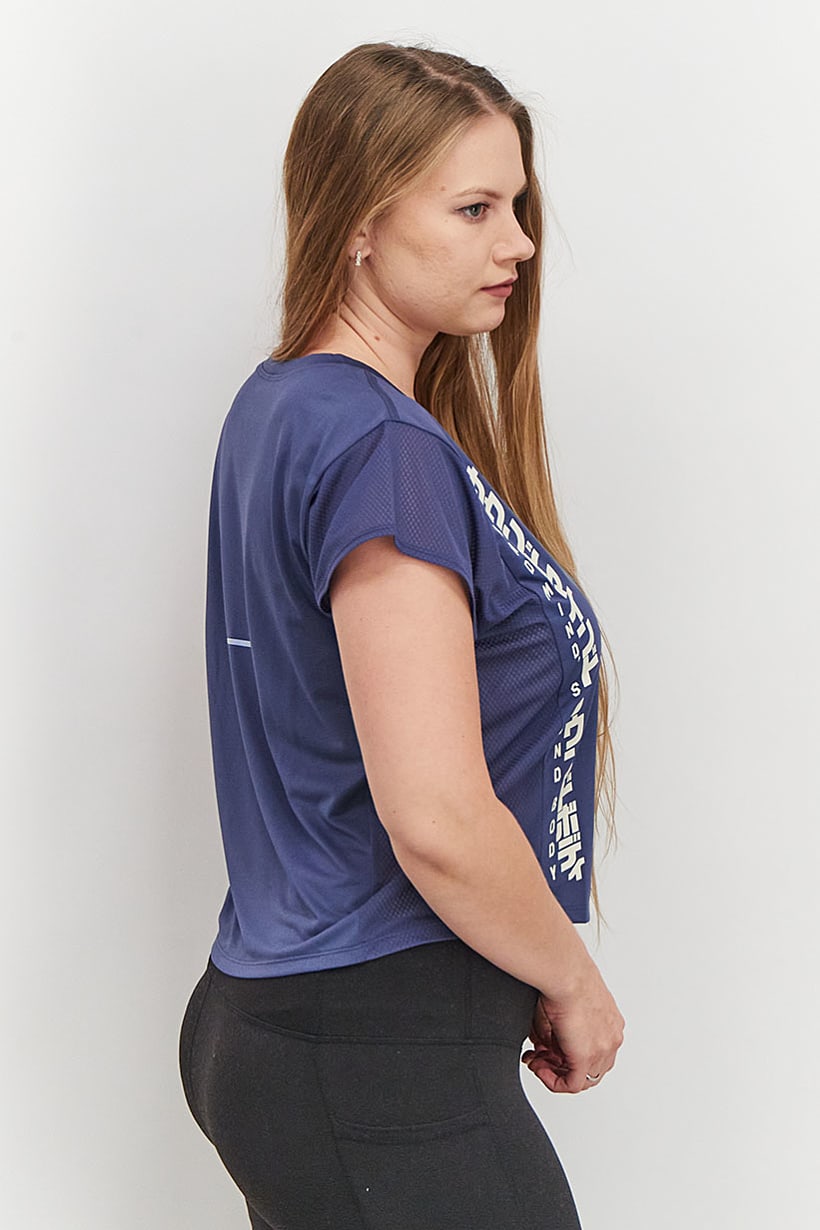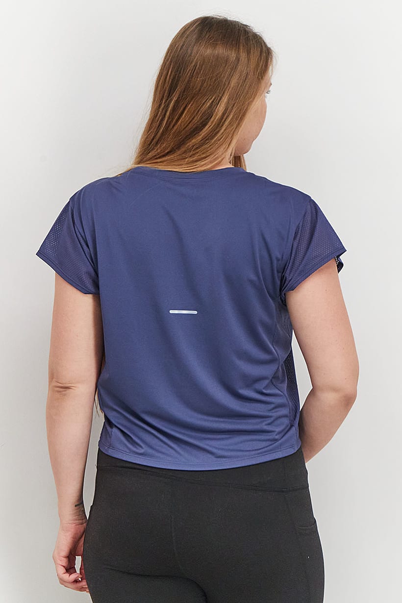 Bottom Hem : Straight, Care : Machine washable, Fit : Sportswear Fit, Ideal For : Women, Size shown : International, Sleeve Length : Short Sleeve, Thickness : Light, Type of Sport : Running, Types of Hem : Straight hem, Types of Neckline & Collar : Crew neckline, Disclaimer : Product color may slightly vary due to photographic lighting sources or your monitor settings., Fabrics : 100% Polyester, Occasion : Sport, Pattern & Print : Brand Logo, Sportswear Type : Tops, Types of Closures : Pullover, Color Family : Navy Blue,