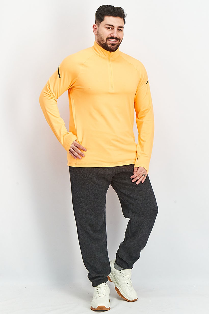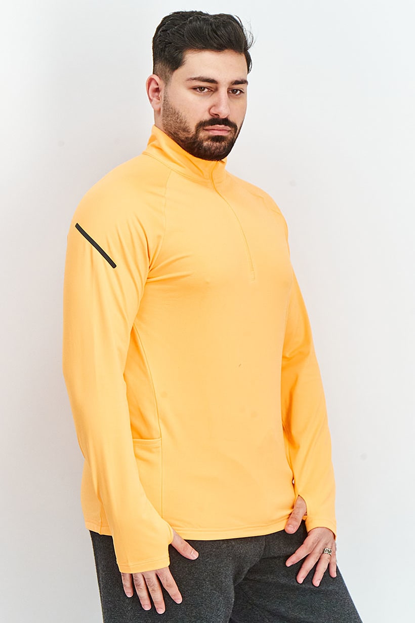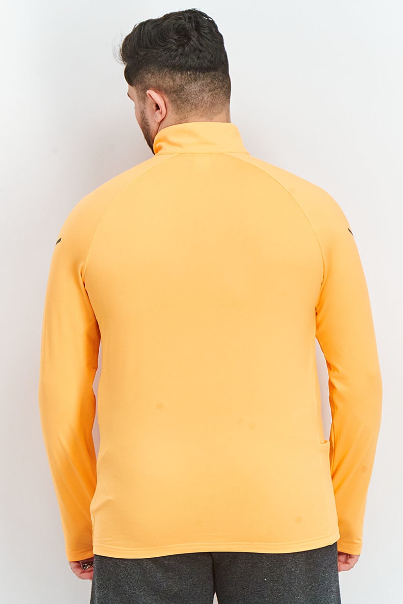 This product is suitable for men and is designed for training purposes. It is made of 87% polyester and 13% elastane, making it machine washable. The product features a plain/solid pattern and print, with a zipper closure. Please note that the color of the product may vary slightly due to photographic lighting sources or monitor settings. This sportswear includes a t-shirt and pullover, and is available in the color family of orange.