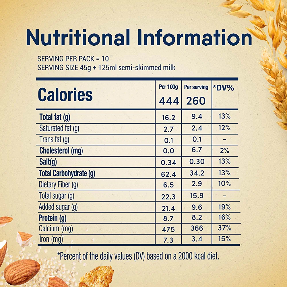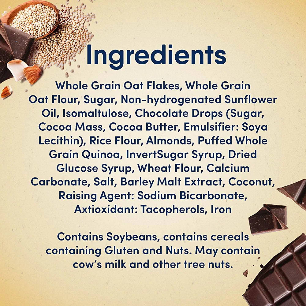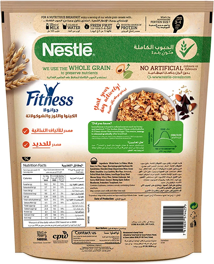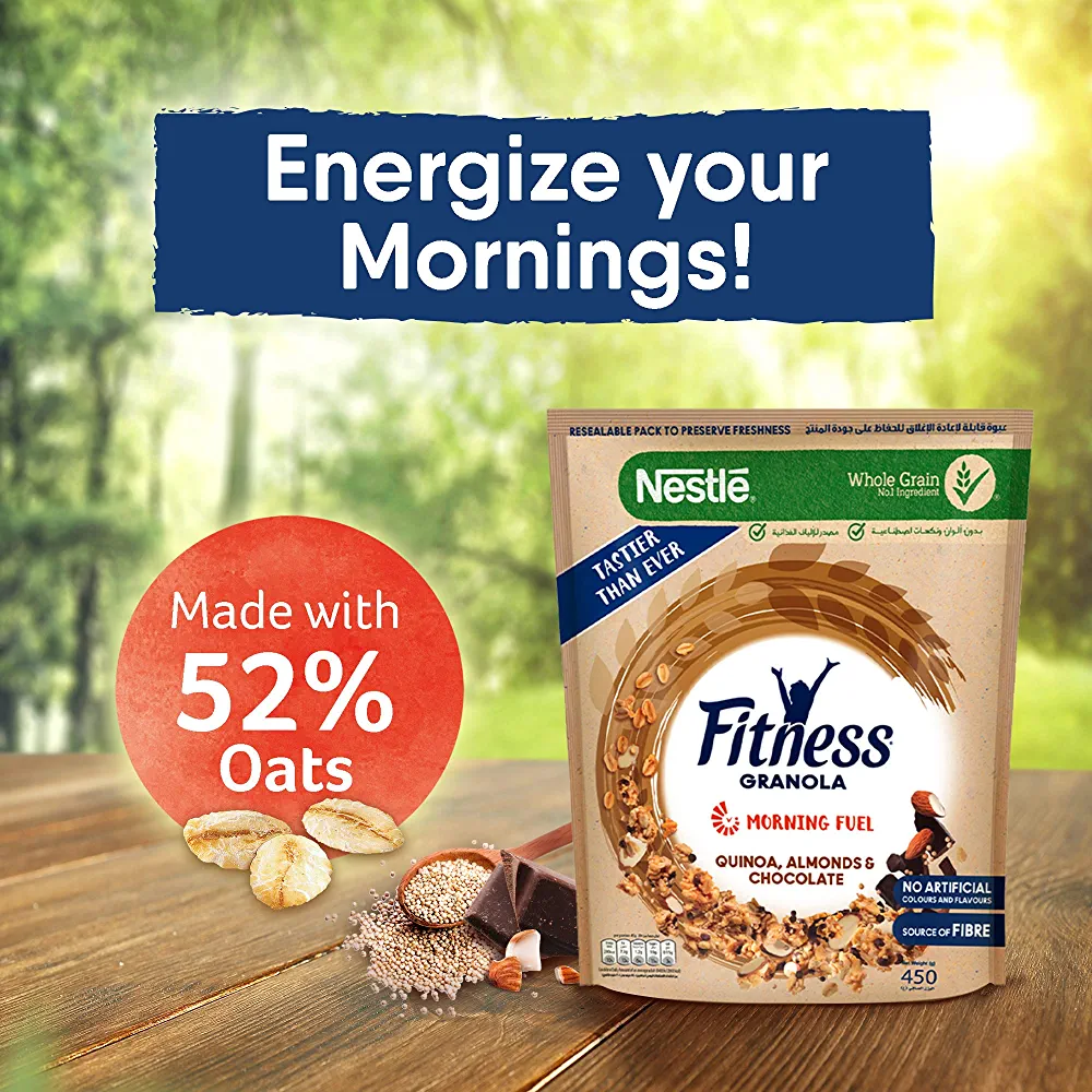 Start your day off right with Nestle Fitness Granola featuring a blend of wholesome wholegrain oats and wheat clusters, paired with the delightful flavors of quinoa, almonds, and chocolate. This breakfast cereal is packed with fiber and a special carbohydrate that gradually releases energy throughout the morning. Additionally, it contains 20g of oats, making it a great source of iron and fiber. Please note that the claim regarding energy release has not been verified.