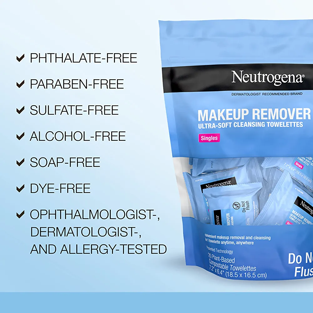 Neutrogena Makeup Remover Facial Cleansing Towelette Singles, Daily Face Wipes Remove Dirt, Oil, Makeup & Waterproof Mascara, Gentle, Individually Wrapped, 100% Plant-Based Fibers, 20 ct