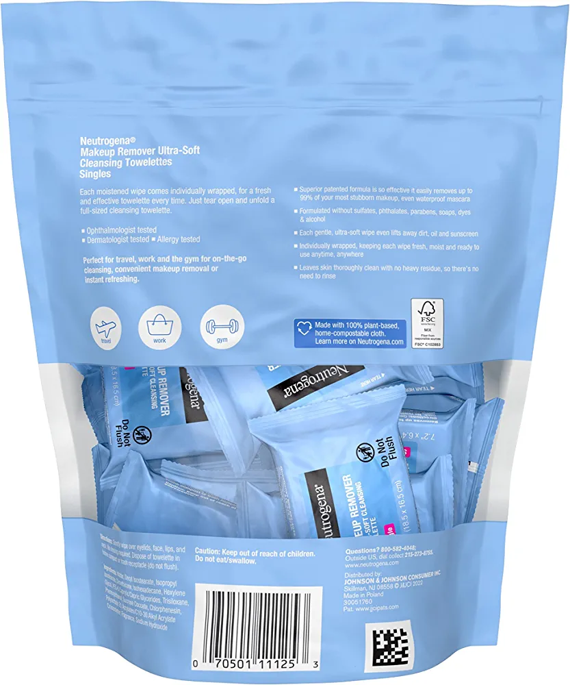 Remove makeup in one easy step with Neutrogena Makeup Remover Face Wipe Singles. These individually wrapped soft and gentle pre-moistened facial cleansing towelettes effectively dissolve all traces of dirt, oil and makeup–even waterproof mascara– for clean, fresh looking skin every day. Our makeup remover features an effective micellar-infused, triple emollient formula that leaves skin feeling conditioned and thoroughly clean with no heavy residue. These facial towelettes also remove sweat, sunscreen, and pollution from skin with no need to rinse after use. Perfect for travel, work, the gym and on-the-go, these daily face wipes are formulated to be gentle on the sensitive eye area. The makeup removing wet wipes are formulated without phthalates, parabens, sulfates, alcohols, soaps, or dyes and are ophthalmologist-, dermatologist-, and allergy-tested. Designed with the earth in mind, the compostable wipes are made with 100% plant-based fibers.