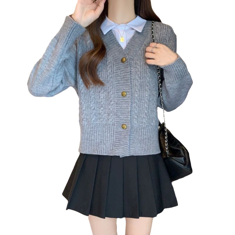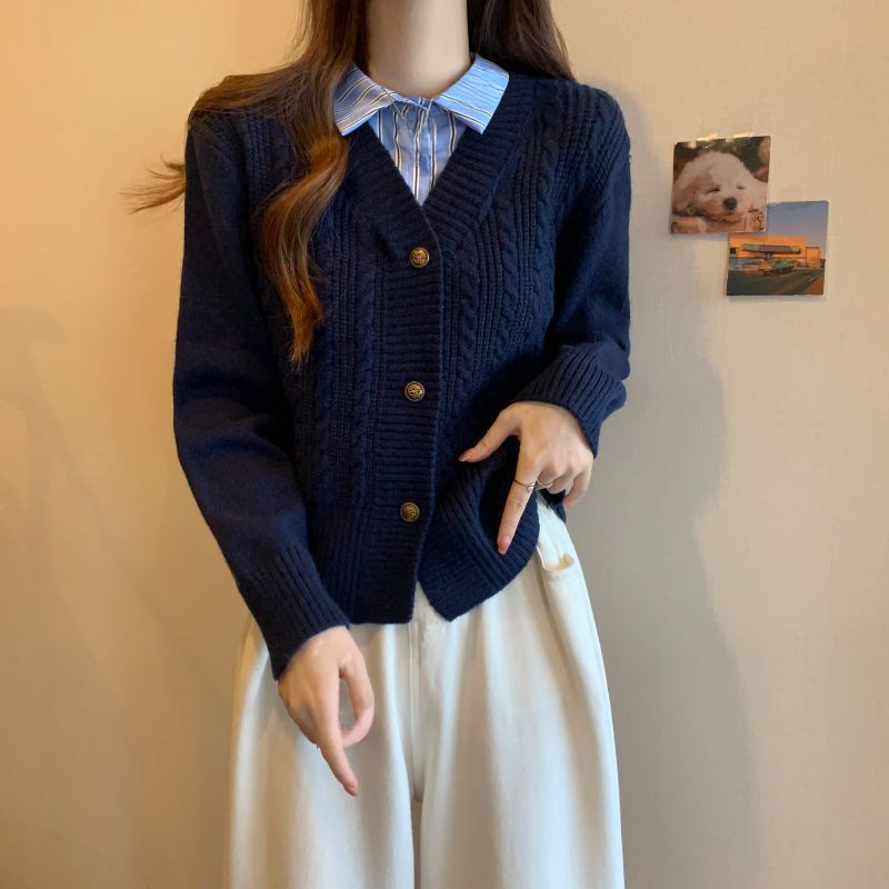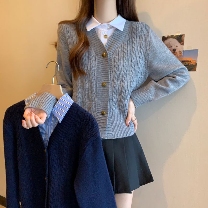 New 2023 autumn fake two-piece college style sweater loose twist versatile slimming simple stitching sweater for women