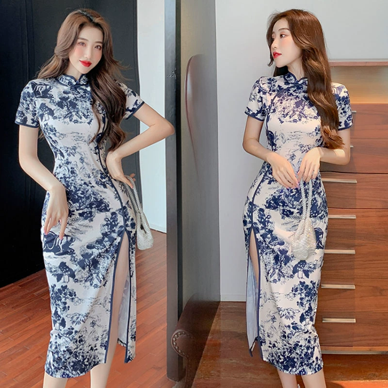 New 2024 summer retro style stand-up collar short-sleeved printed tight slit long cheongsam style dress for women