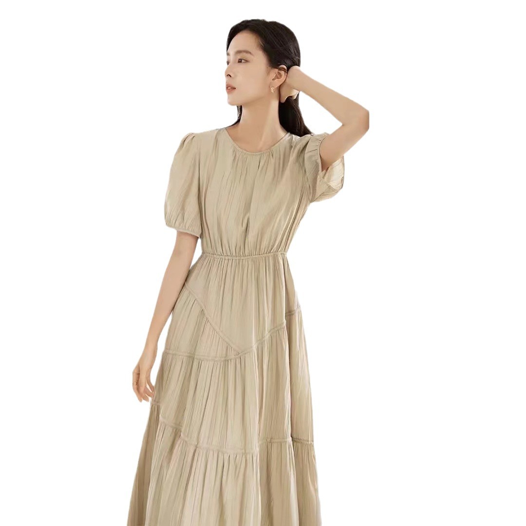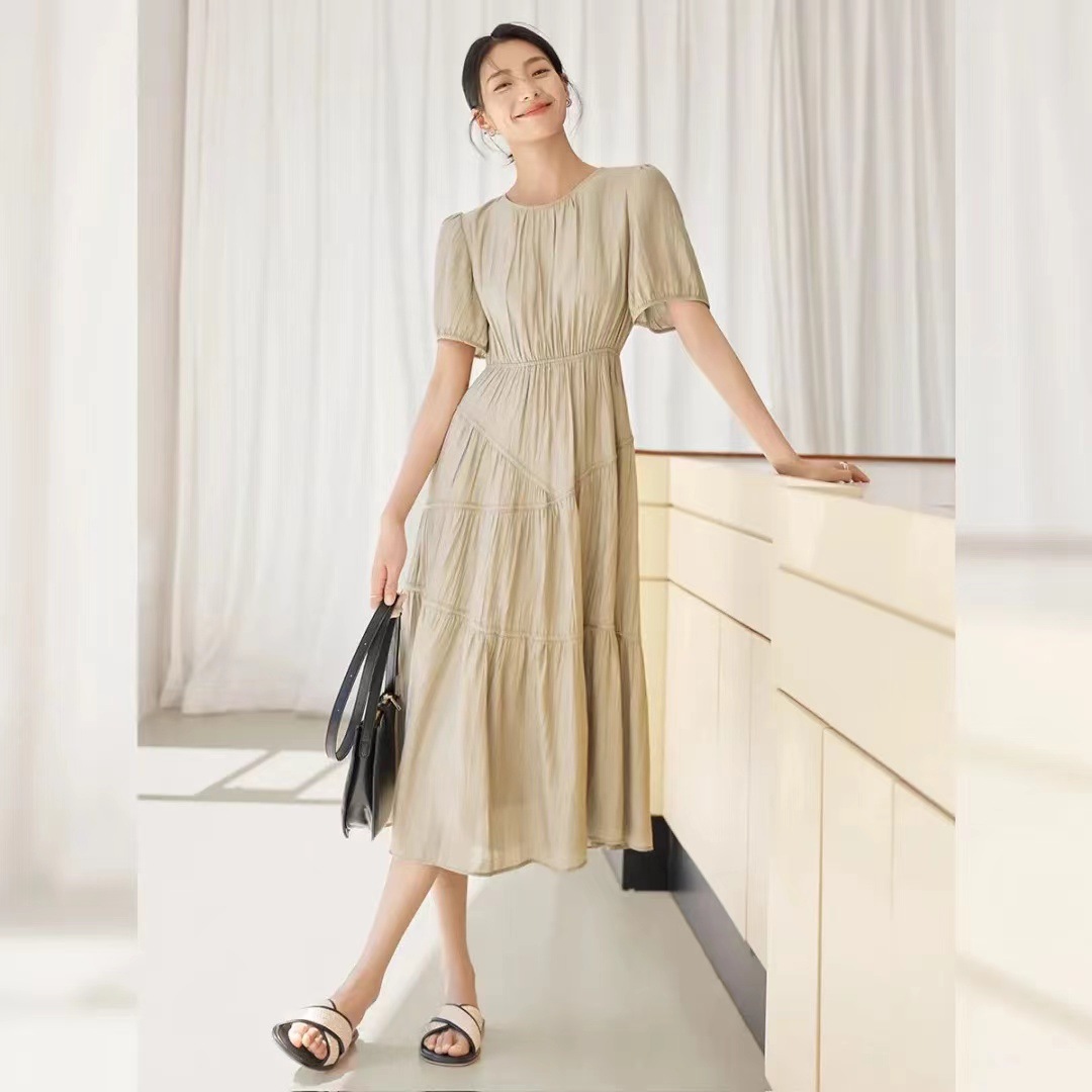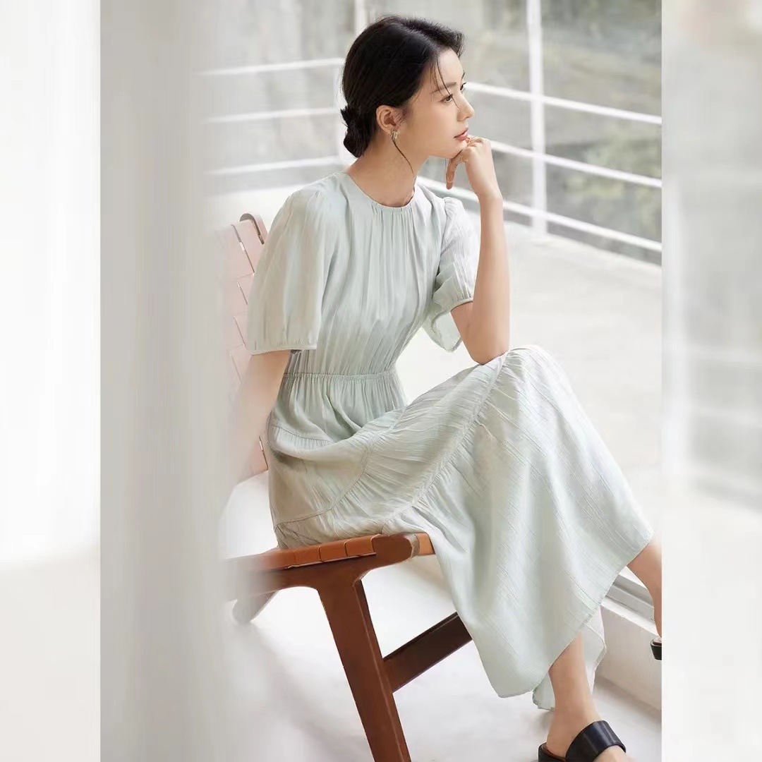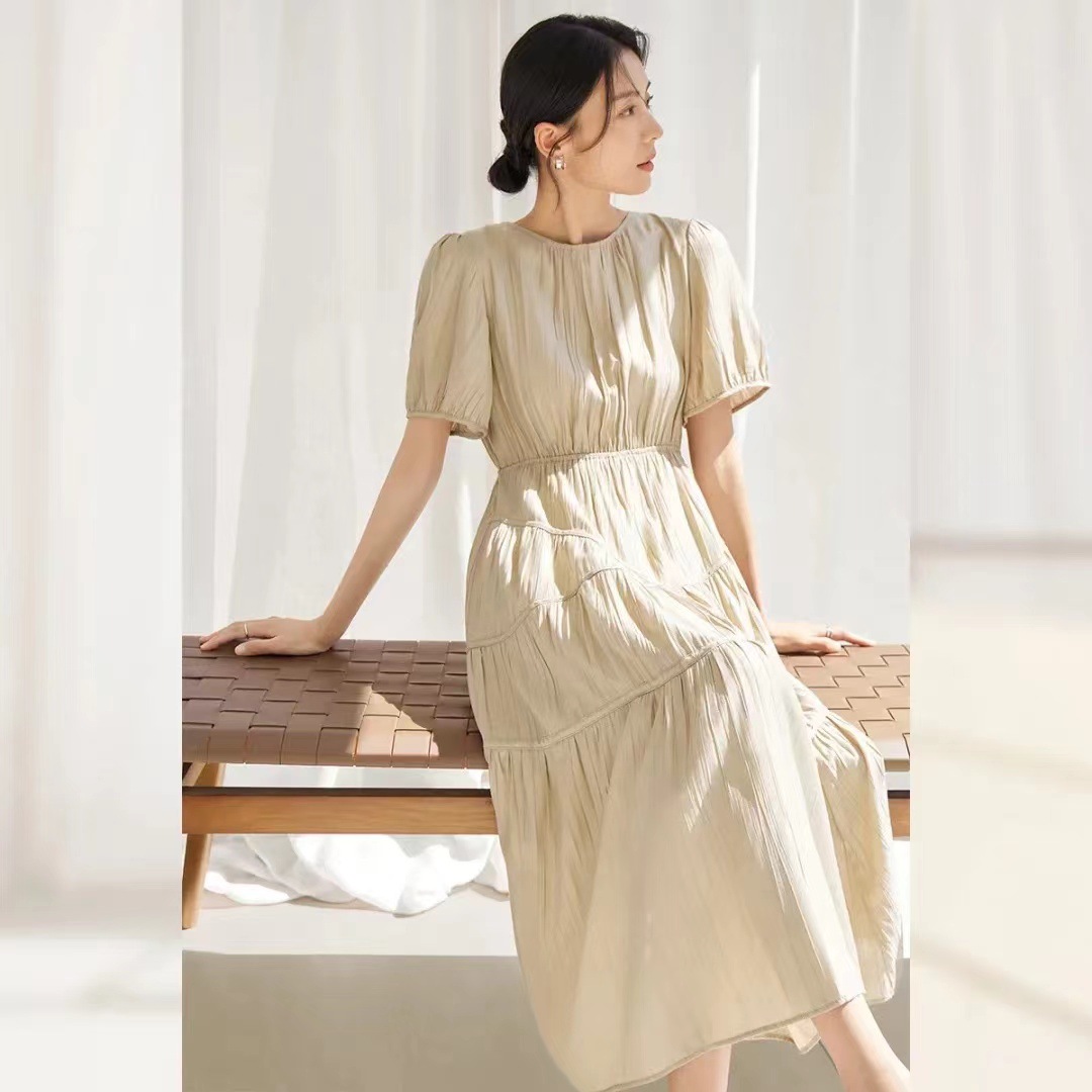 | nameOriginal | New 2024 Summer Wear Light Soft Pleated Texture Fabric Asymmetrical Split Women's Short Sleeve dress |