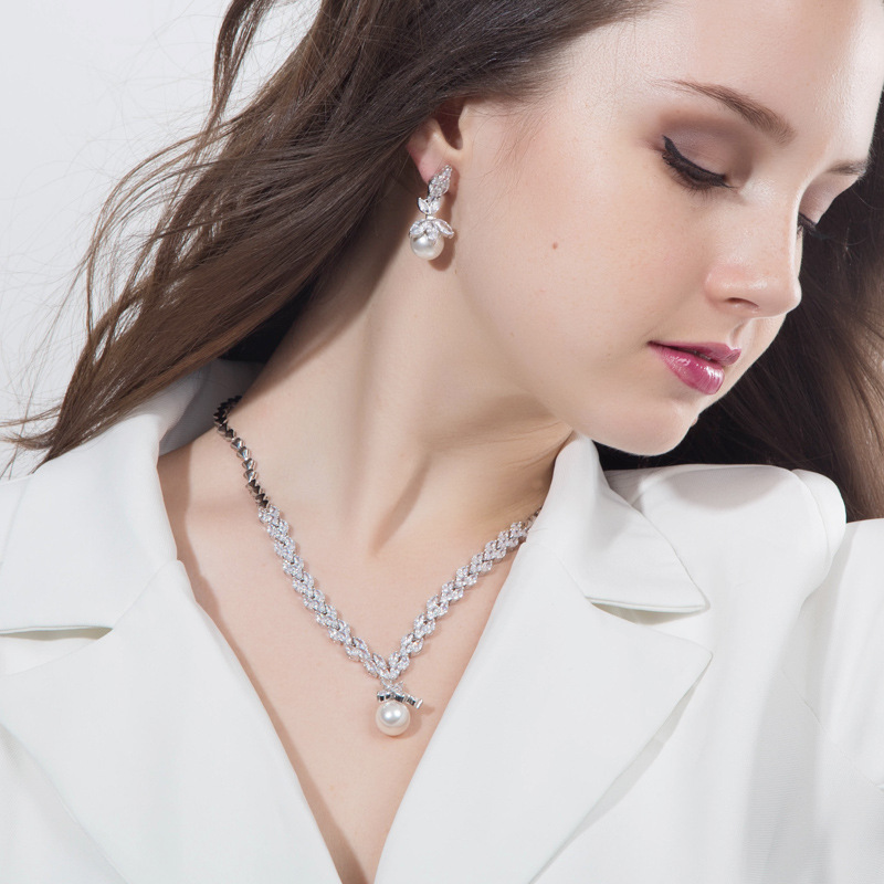 New Bride Jewelry Earrings Necklace Two-Piece Chain Zircon Shell Pearl Wedding Dress Accessories