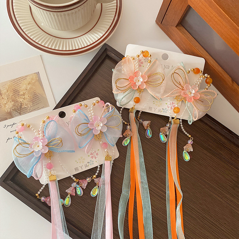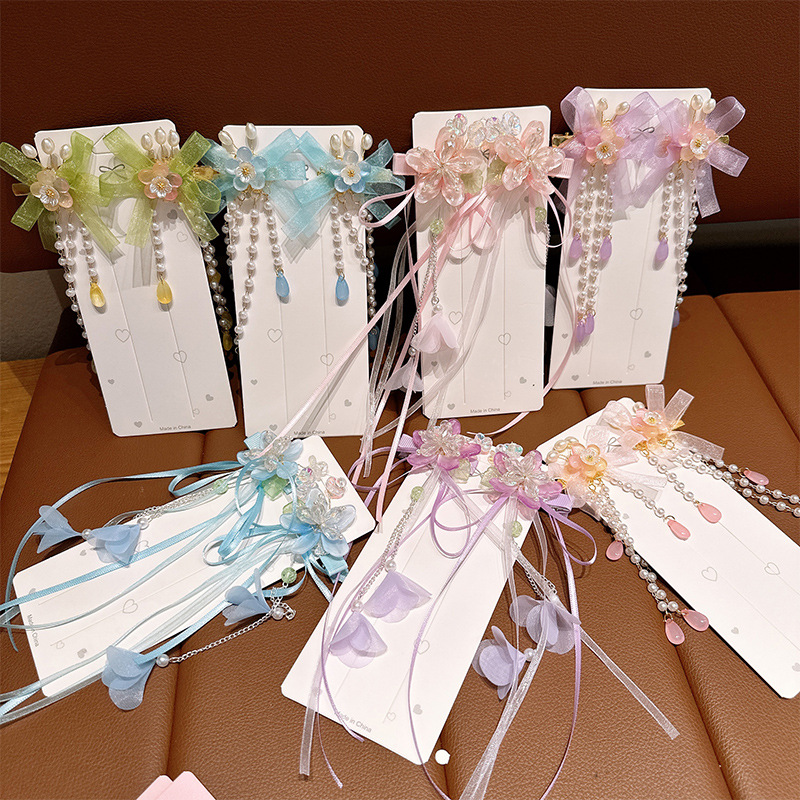 New Children’s Hanfu Headwear Little Girl’s Bow Tassel Hairpin Princess Super Fairy Antique Flower Hairpin Hair Accessories
