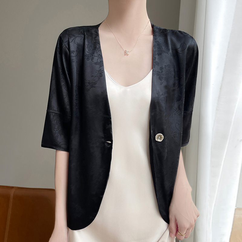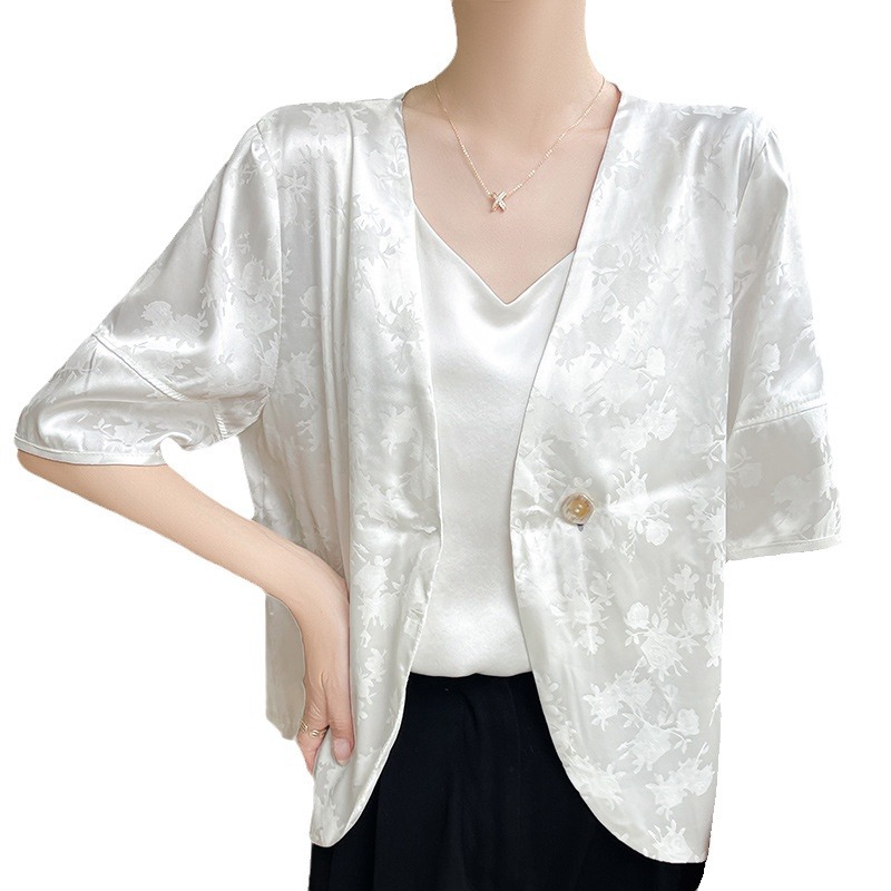 | nameOriginal | New Chinese Acetic Acid Satin Short Sleeve Collarless Suit Jacket Women's One Button Jacquard Lantern Sleeve National Fashion Small Suit |