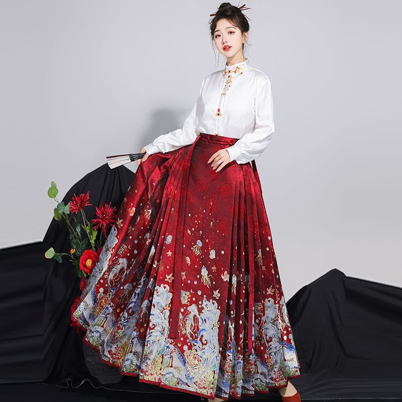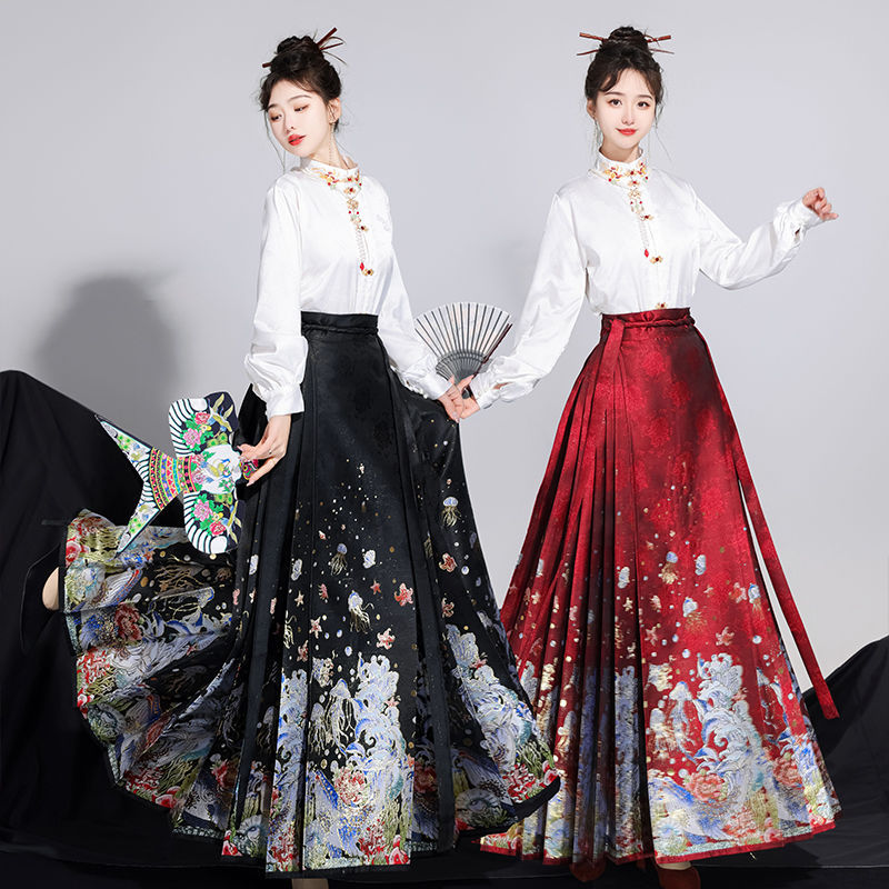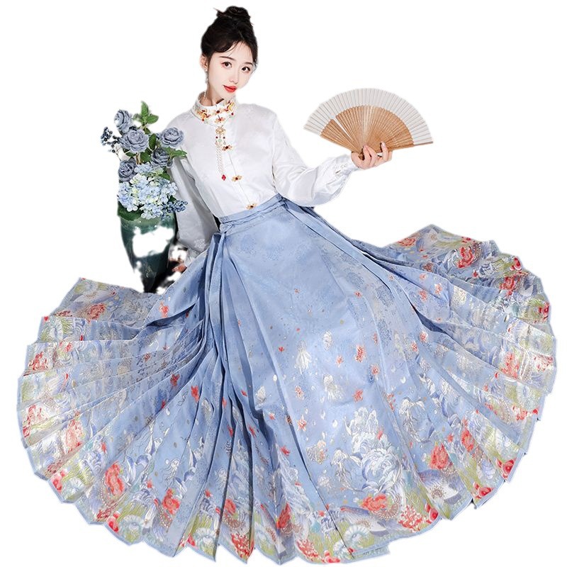 New Chinese Adult Hanfu Women’s [Sea Breeze] Ming-made Improved Guofeng Women’s Gold Makeup Flower Horse-faced Skirt Daily Commuter