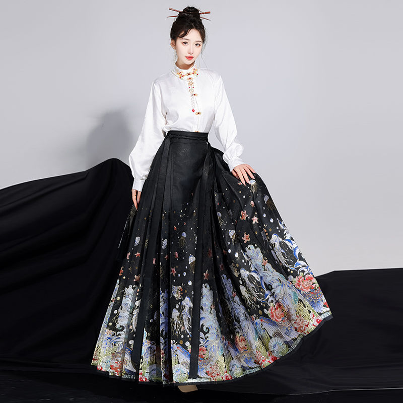 New Chinese Adult Hanfu Women's [Sea Breeze] Ming-made Improved Guofeng Women's Gold Makeup Flower Horse-faced Skirt Daily Commuter