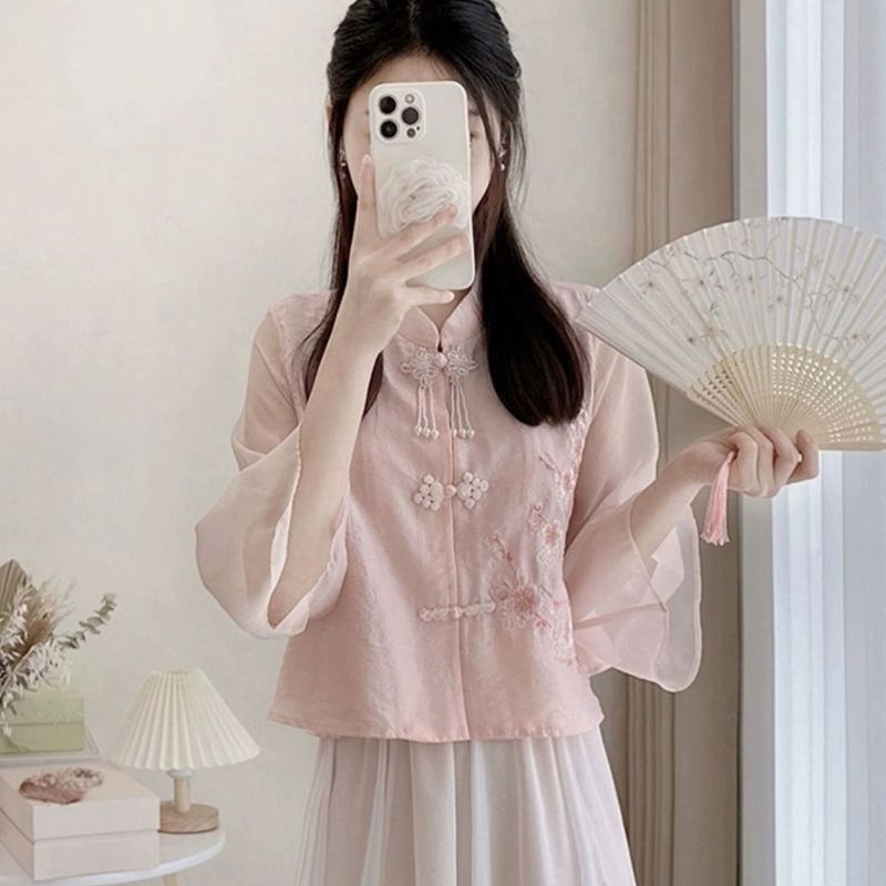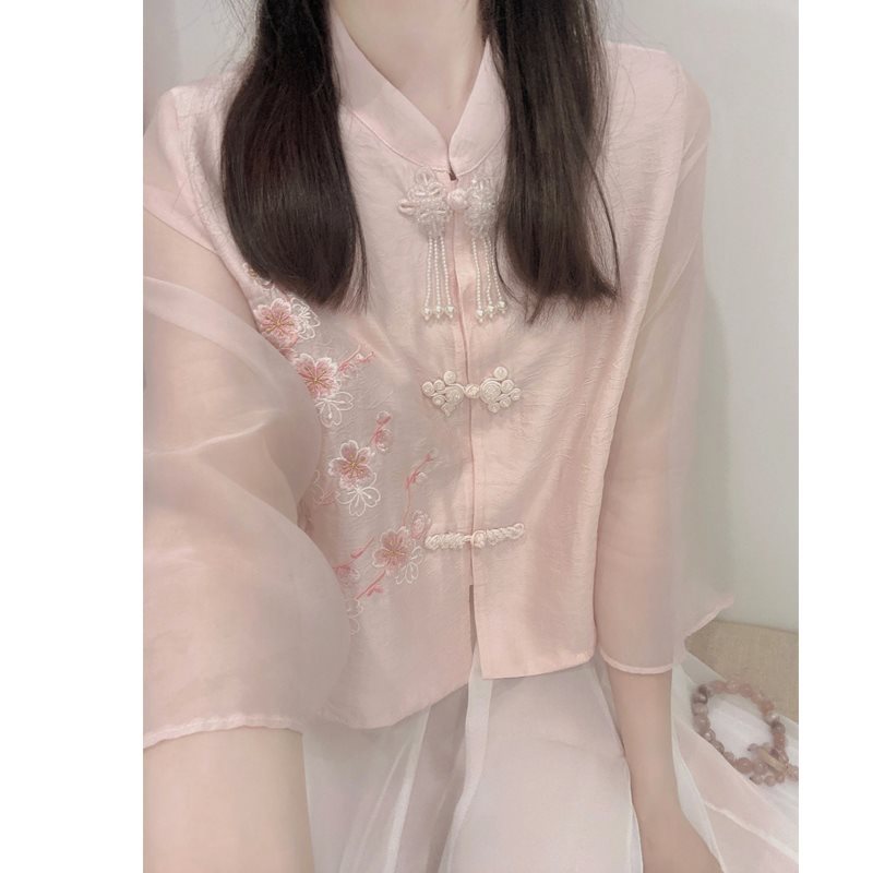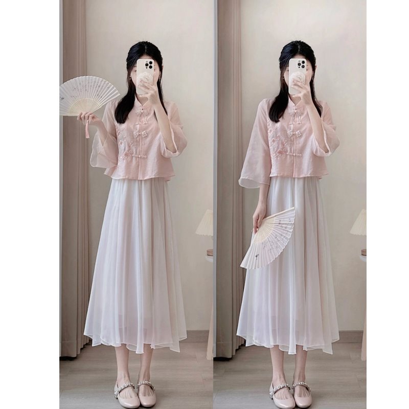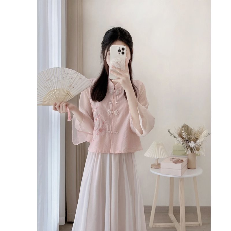 | nameOriginal | New Chinese Light National Style Pink Coat Cheongsam Top with Buckle for Summer Small Men Hanfu Skirt Two-piece Suit for Women |