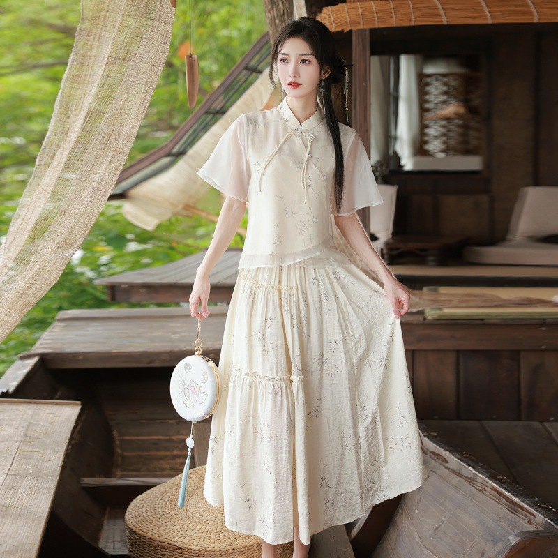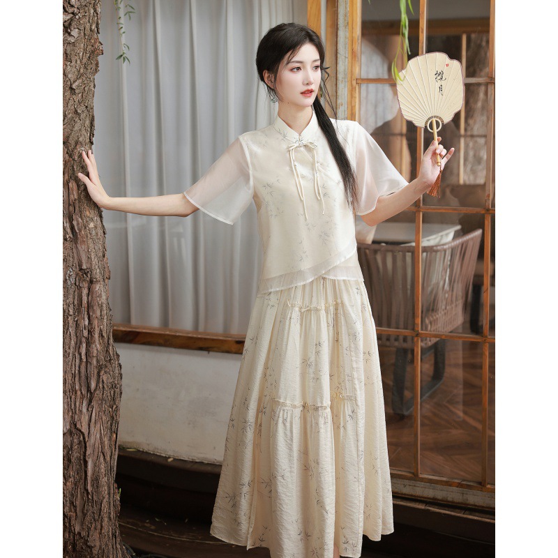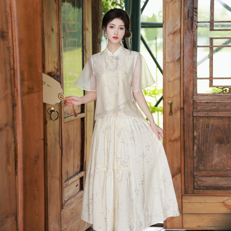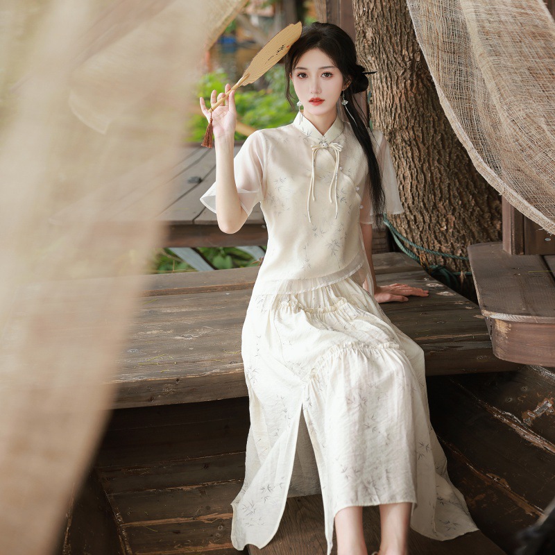 | nameOriginal | New Chinese Style Bamboo Shadow Button Small Shirt High Waist A- Line Skirt Summer New National Style Women's Suit |