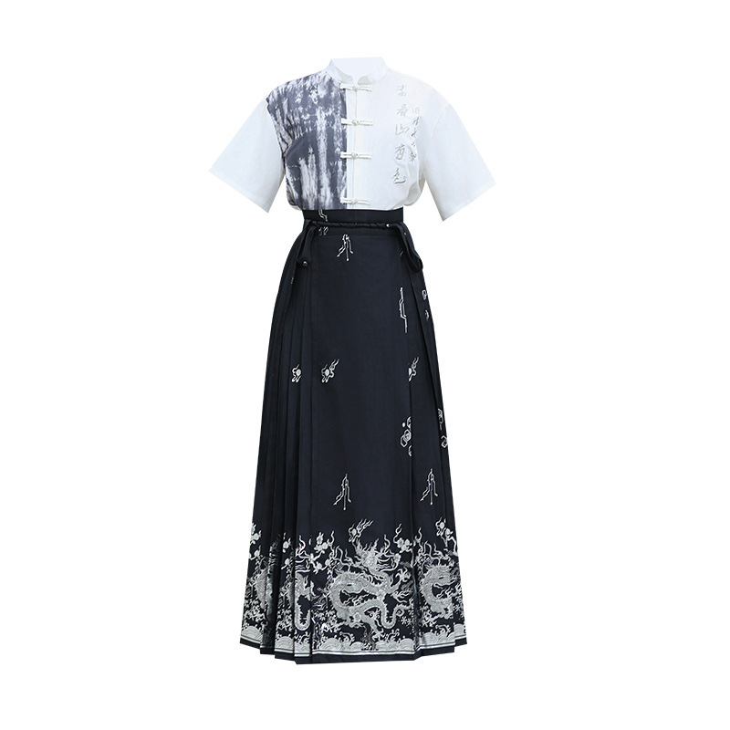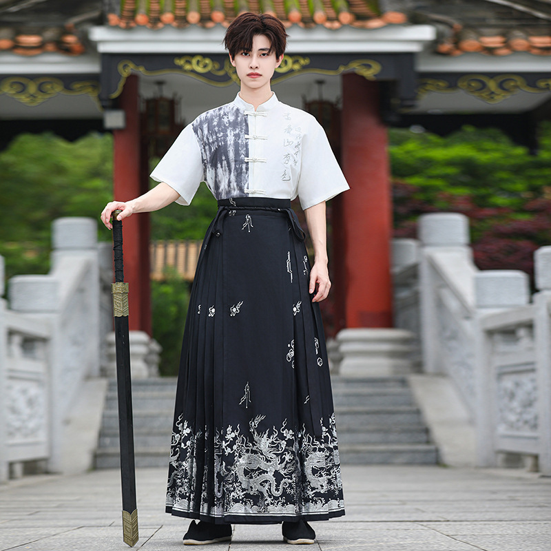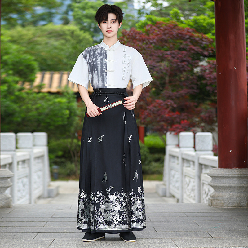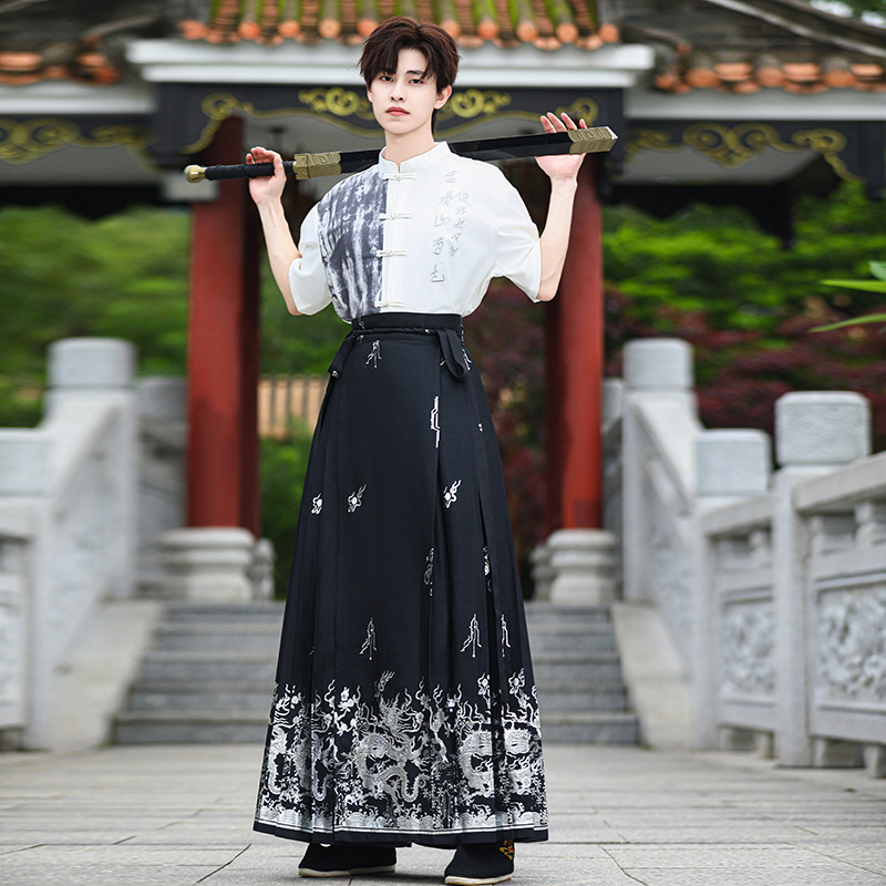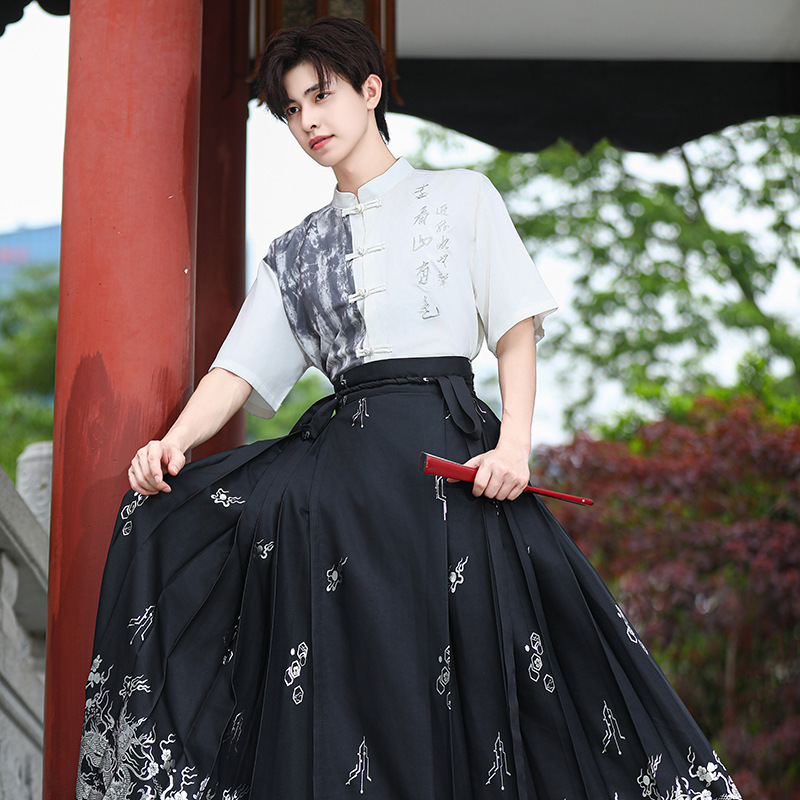 | nameOriginal | New Chinese-style Bronzing Horse-faced Skirt Two-piece Set Men's 2024 Vintage Improved Hanfu Embroidered Buckle Short-sleeved Shirt Top |