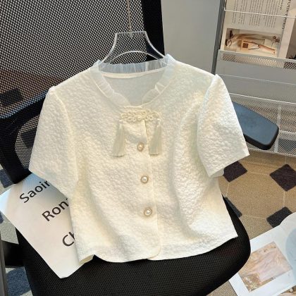 | nameOriginal | New Chinese-style Button Jacquard Chiffon Shirt Niche Design Slim-fit Short Ear Collar Top for Women |