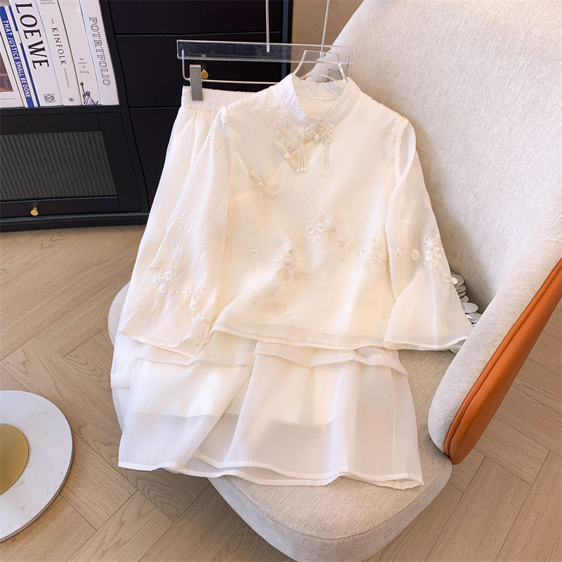 | nameOriginal | New Chinese-style Chinese-style disc-button stand-collar chiffon shirt for women early spring elastic high-waisted A-line skirt two-piece suit |