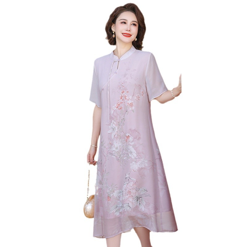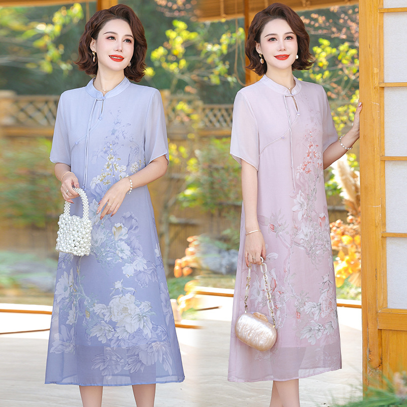 New Chinese Style Mother's Summer Dress dress 2024 New Style Middle-aged and Old People's Style Women's Summer Chiffon Short-sleeved Long Dress