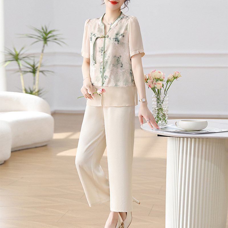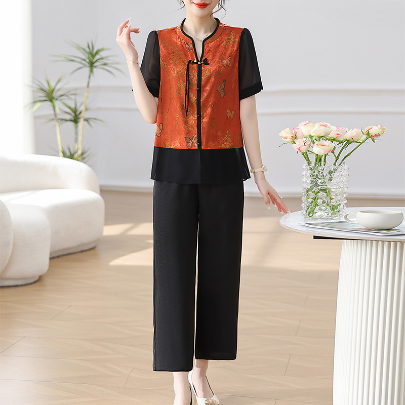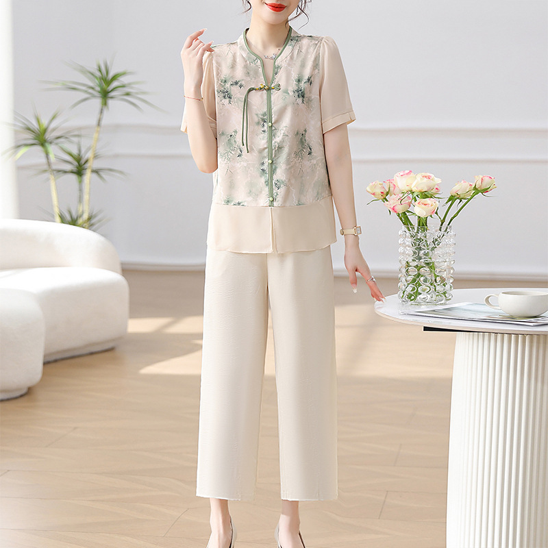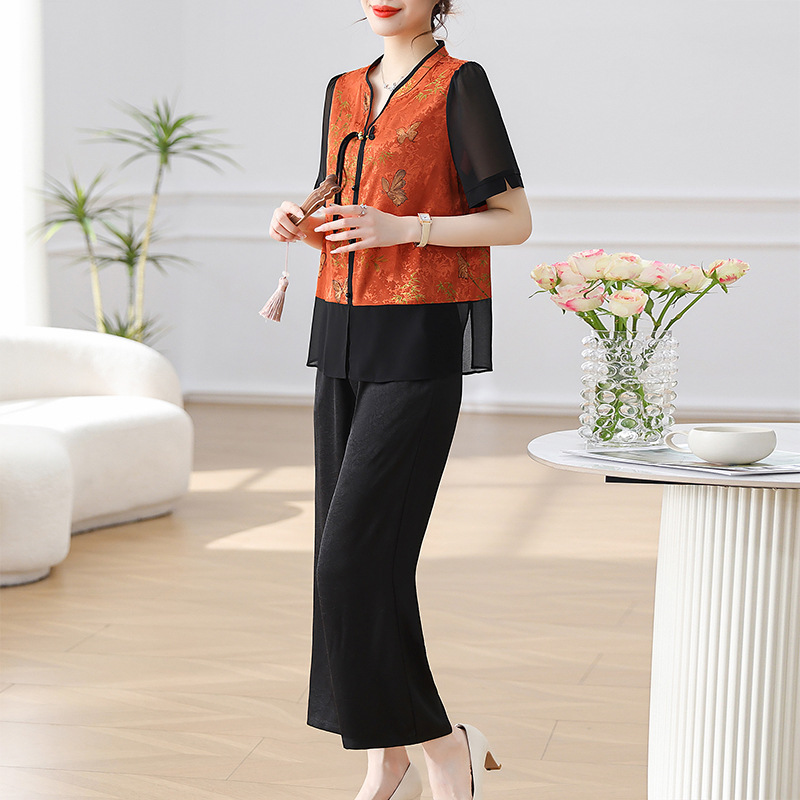 New Chinese Style Mother’s Summer Short-sleeved Shirt Retro Crop Button Middle-aged and Elderly Women’s Summer National Style Top Small Shirt suit