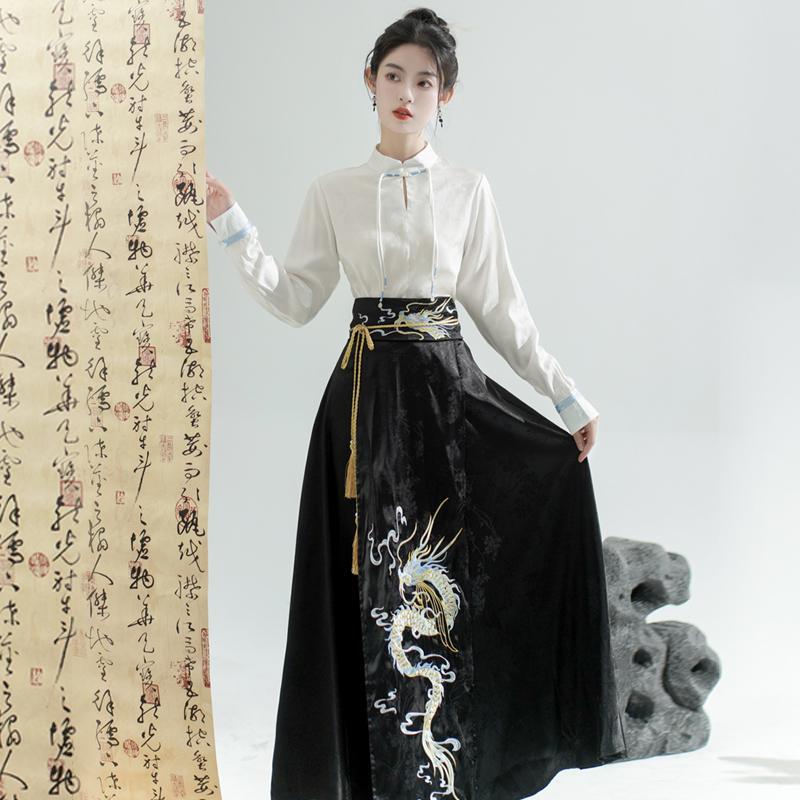 New Chinese Style National Style Ancient Style Hanfu Top Spring and Autumn Elegant Collar Shirt Women’s Long Sleeve Shirt with Horse-faced Skirt for Women