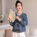 New Chinese Style National Style Buckle Blue Denim Coat Women’s 2024 Spring New Design Sense Spliced Sleeve Short Top
