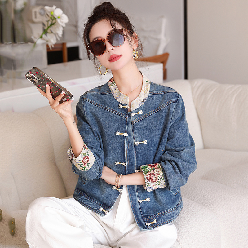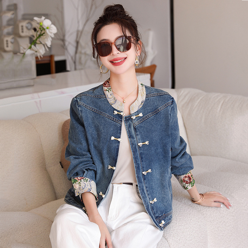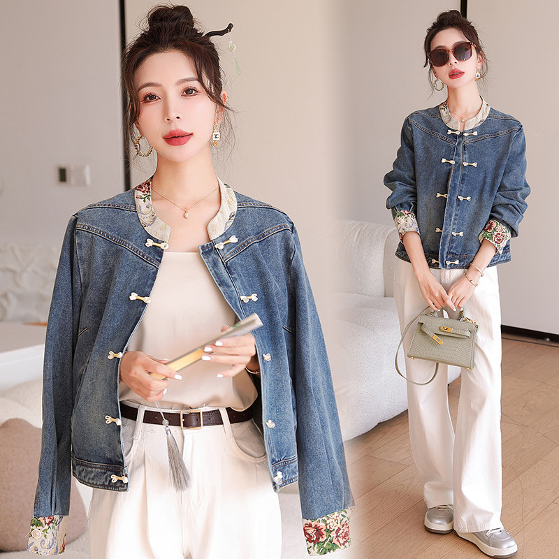 New Chinese Style National Style Buckle Blue Denim Coat Women's 2024 Spring New Design Sense Spliced Sleeve Short Top
