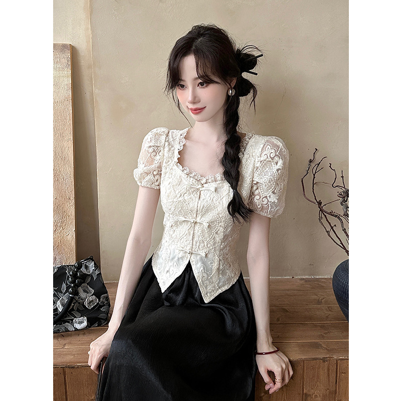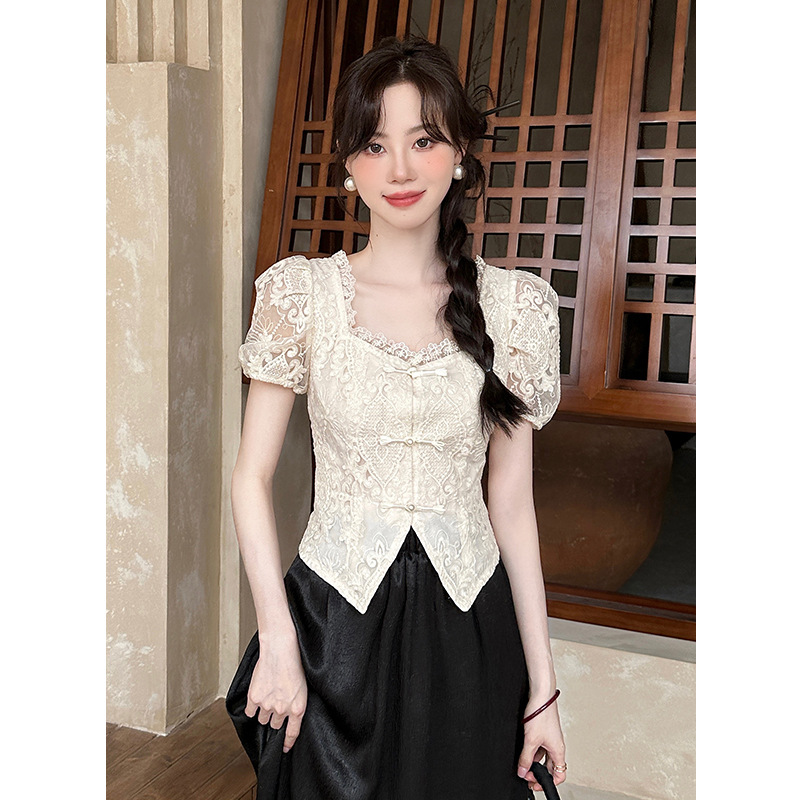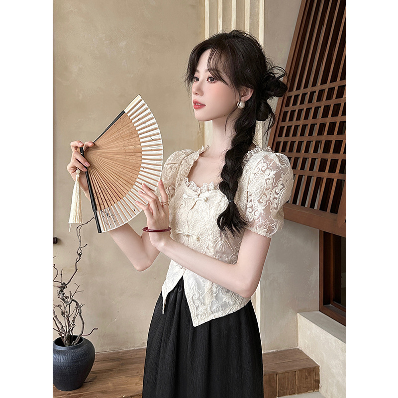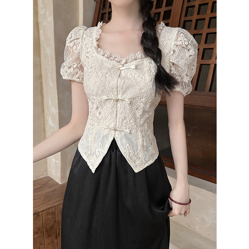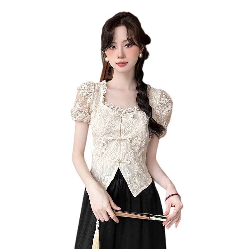 New Chinese Style National Style Lace Short Sleeve Shirt Women's Summer 2024 New Style Embroidered Square Collar Top Western Style Chic Small Shirt