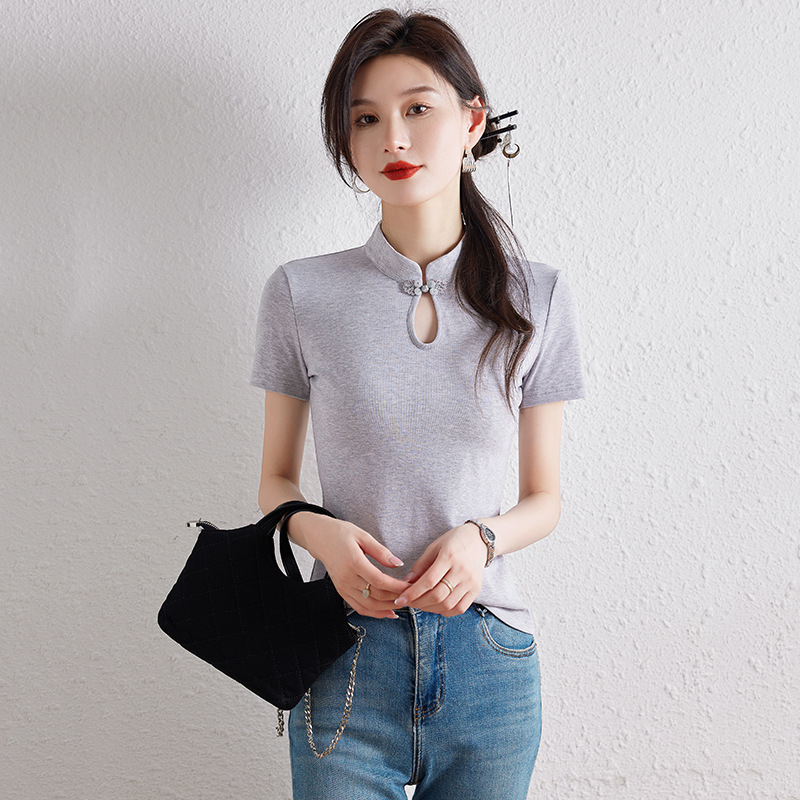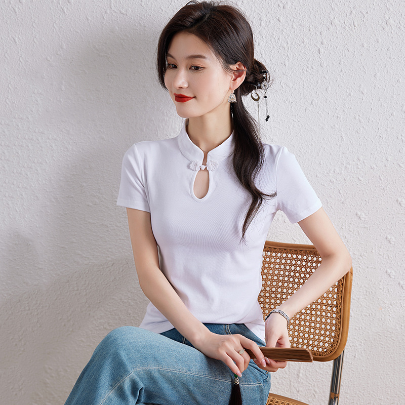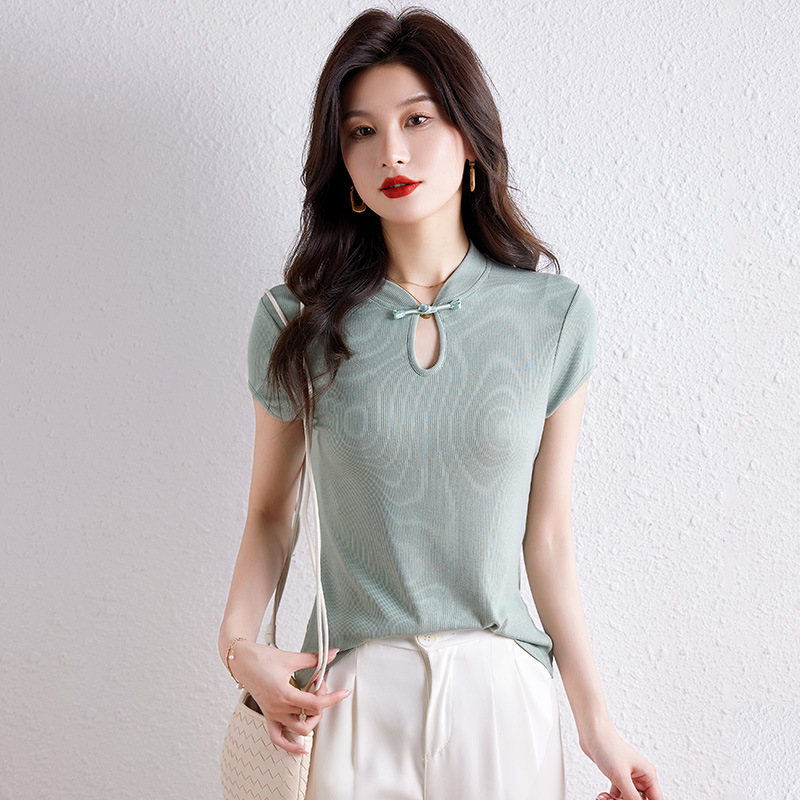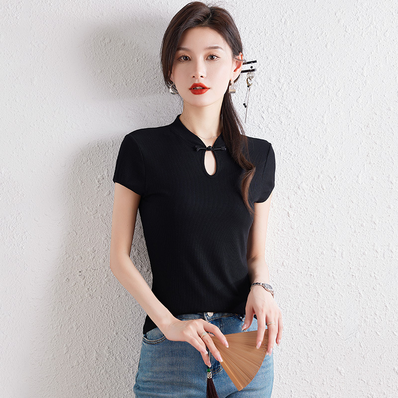 New Chinese Style National Style Shoulder Short-sleeved T-shirt Women's Summer Design Sense Niche Slim-fit Vertical Collar Buckle Knit Top