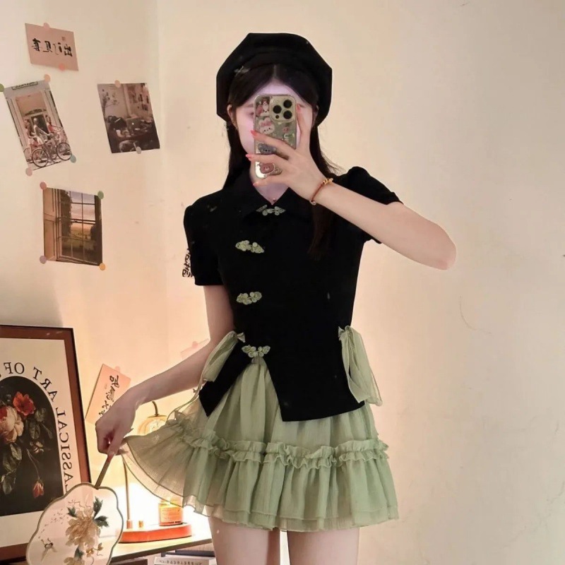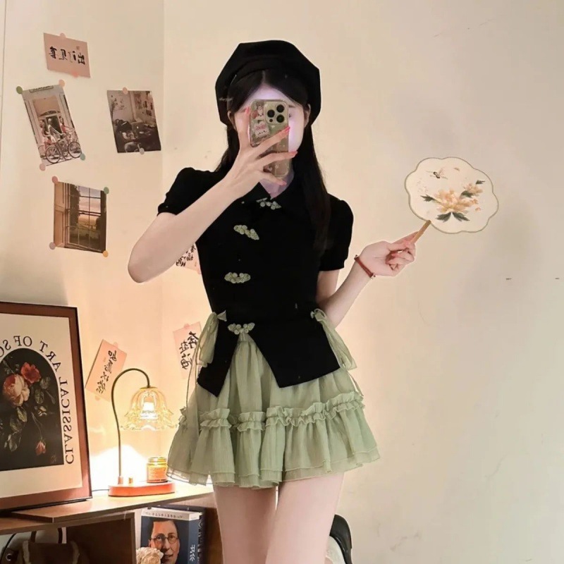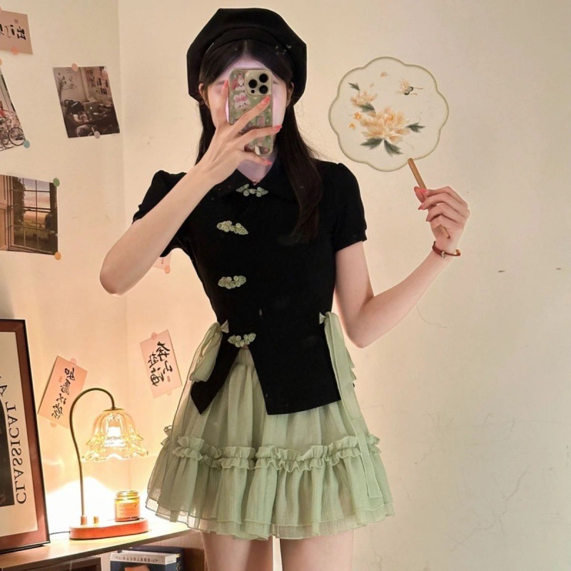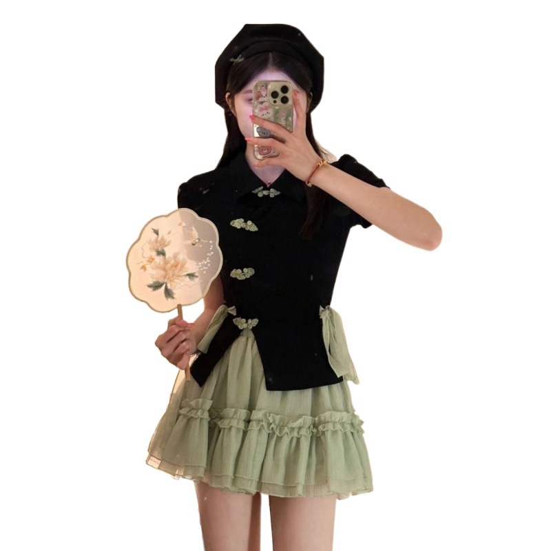 New Chinese Style National Style suit Women's Summer New Arrival Buckle Design Short Top with Tight Waist Slimming Skirt