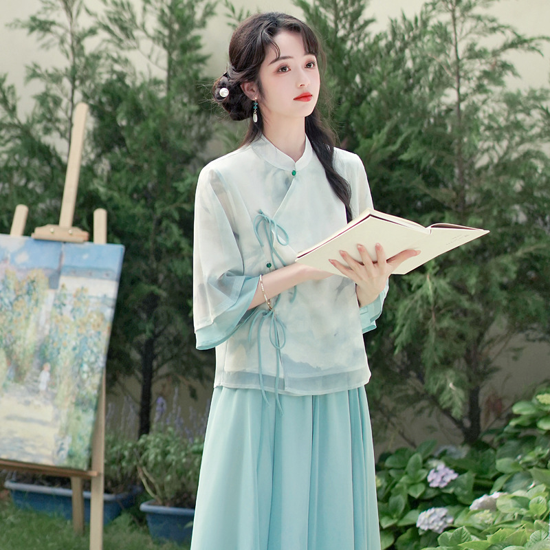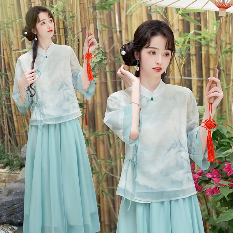 New Chinese Style Retro Collar Ink Bamboo Printing Tang Suit Han Elements Improved Hanfu Cheongsam Top Guofeng Tea Clothing suit