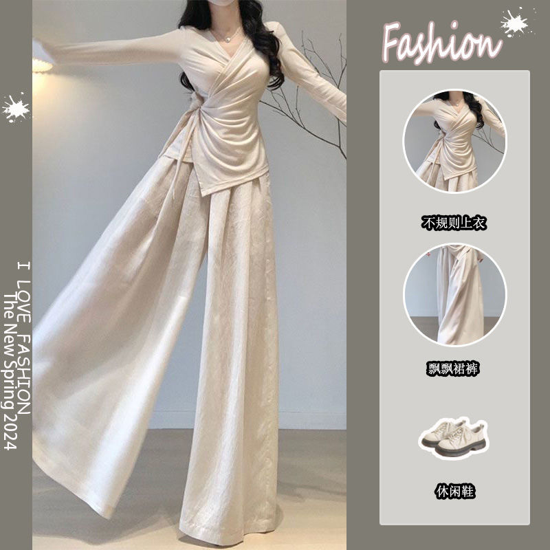 New Chinese Style Retro Irregular Top suit Women’s Summer Design Sense Long Sleeve T-shirt High Waist Wide Leg Fluttering Culottes