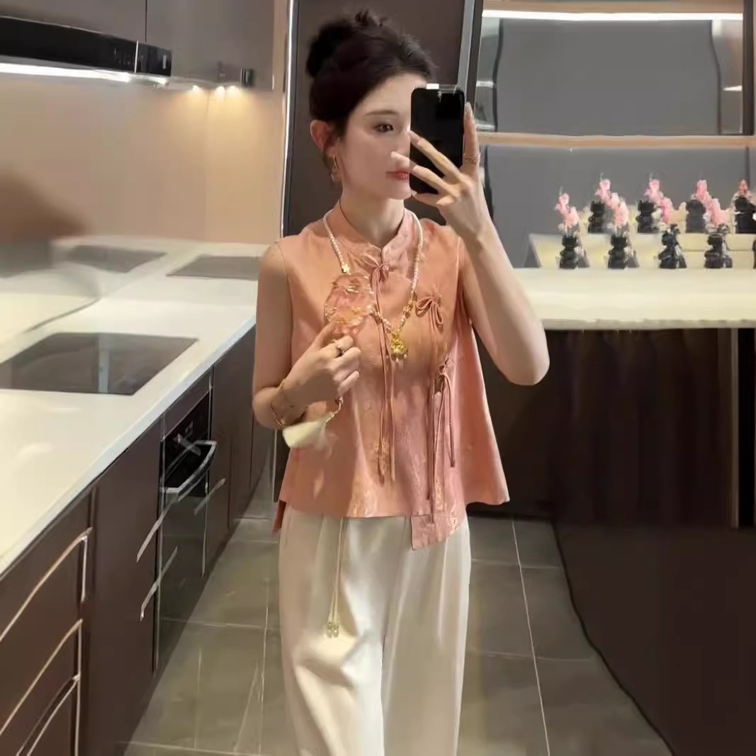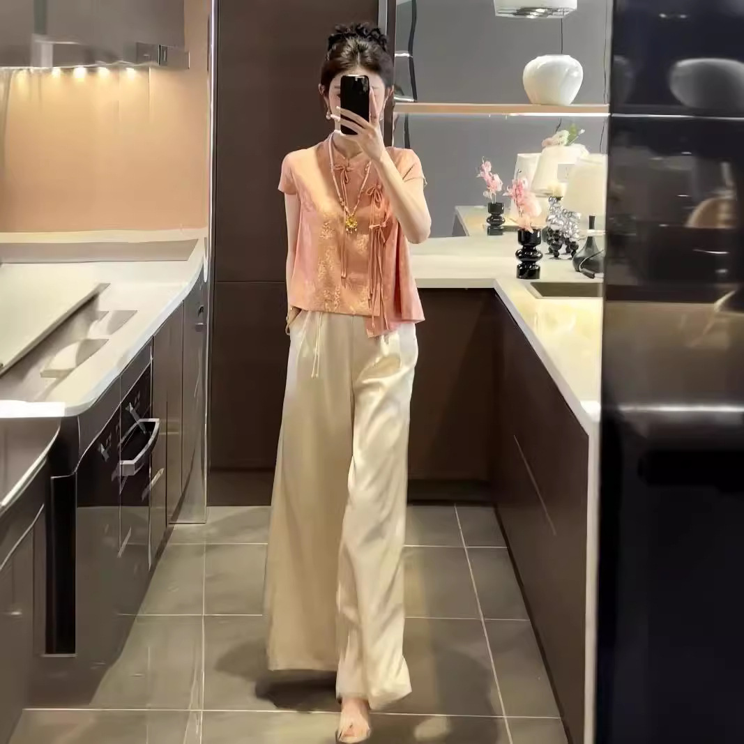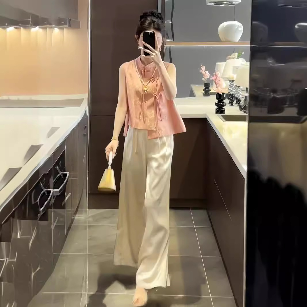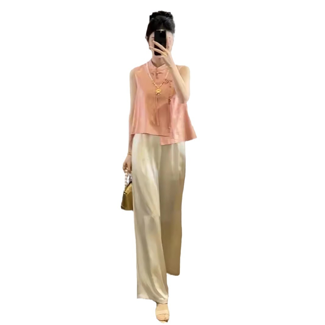 | nameOriginal | New Chinese Style Retro National Style suit Women's Summer New Elegant Two-piece Set with Buckle and Vertical Collar Vest Top Wide Leg Pants |