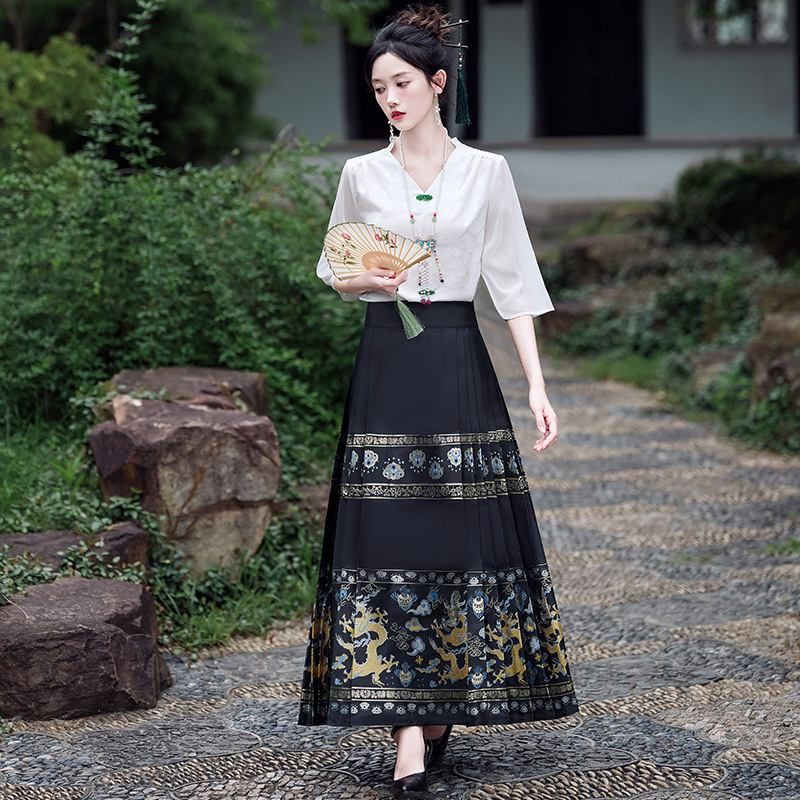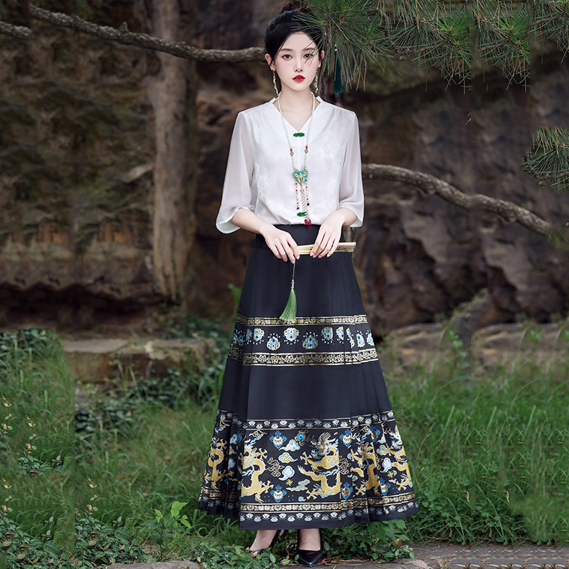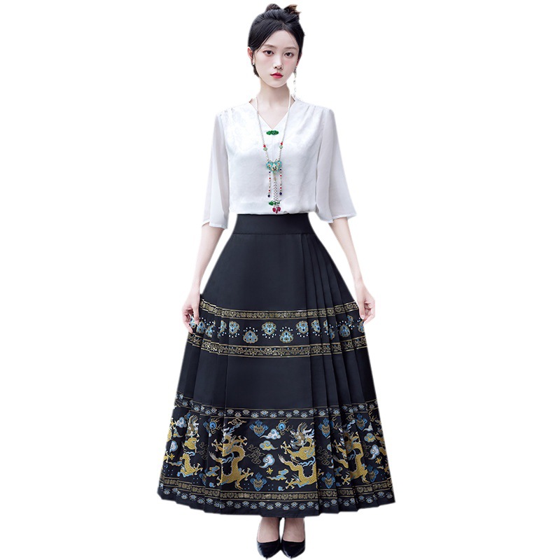 | nameOriginal | New Chinese Style Women's Stand Collar Buckle Retro Ethnic Style Jacquard Heavy Embroidered Black Golden Dragon Horse Face Dress Two-piece Set |