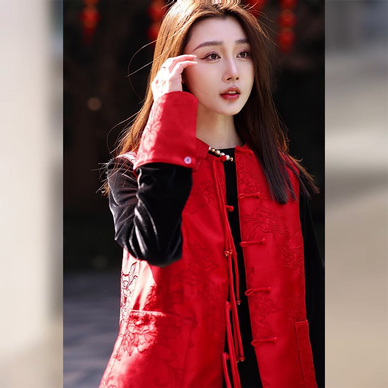 New Chinese Tang Suit Chinese Style Dragon Year New Year Wear Velvet Top Red Buckle Vest suit Women's Early Spring