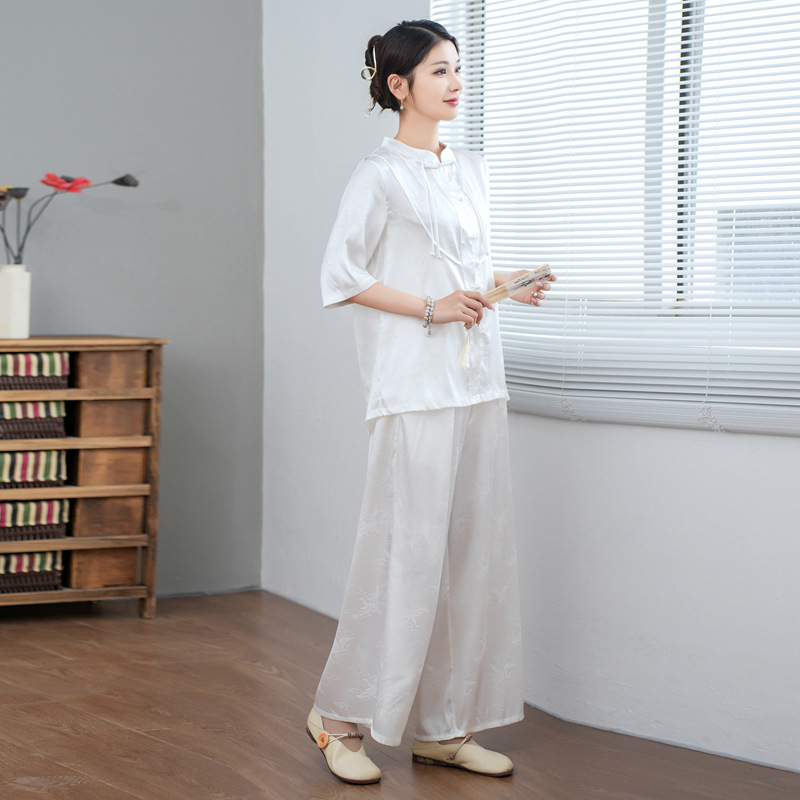 | nameOriginal | New Chinese Zen Style suit Silk Jacquard Tassel Button Shirt Women's Wide Leg Casual Pants Two-piece National Style Tang Suit |